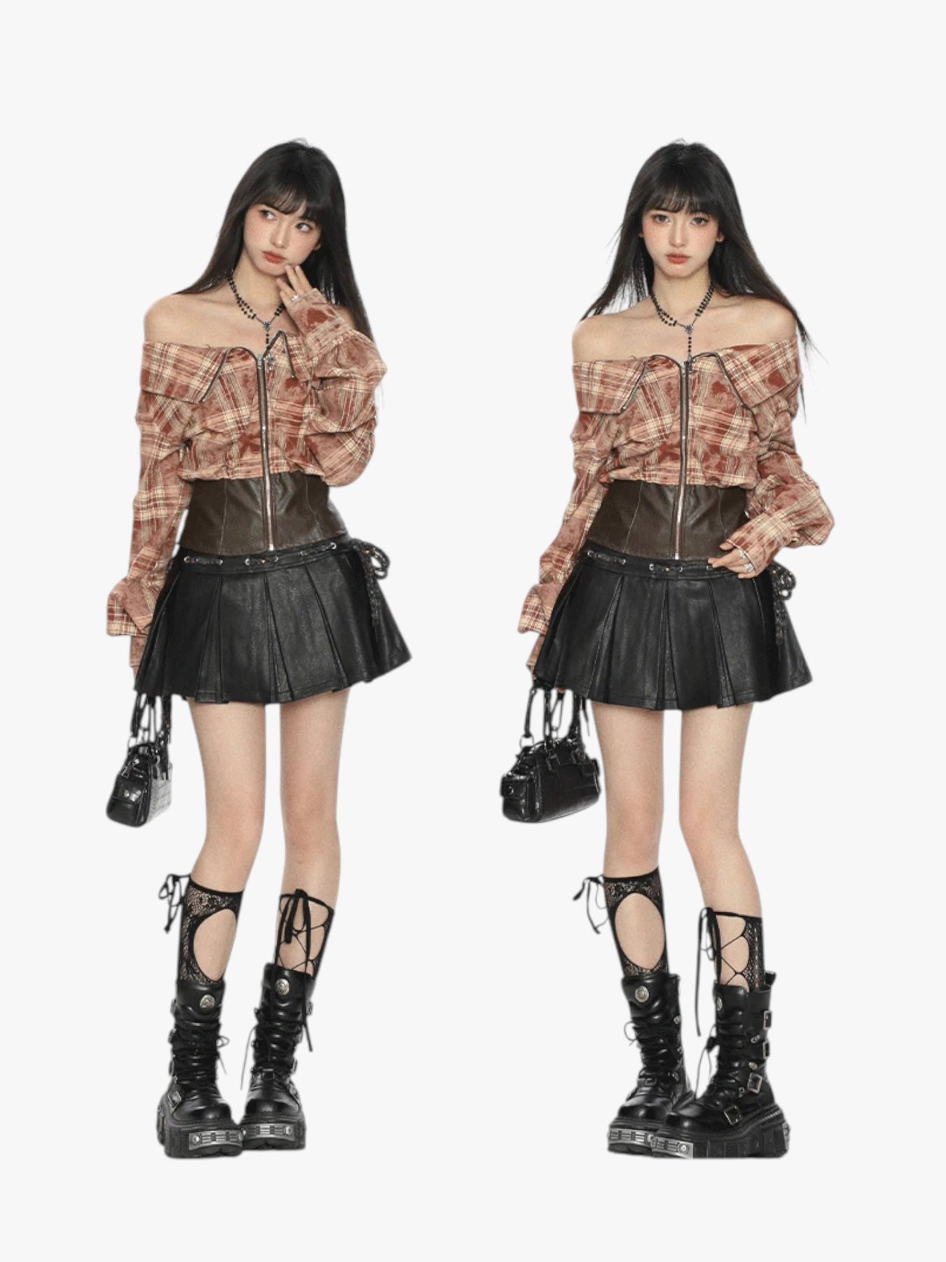Elevate your street style with this edgy off-shoulder plaid jacket. Featuring a bold oversized collar, front zipper closure, and a contrasting faux leather waist panel for a cinched silhouette. Perfect for layering with skirts or cargos for a grunge-chic vibe.