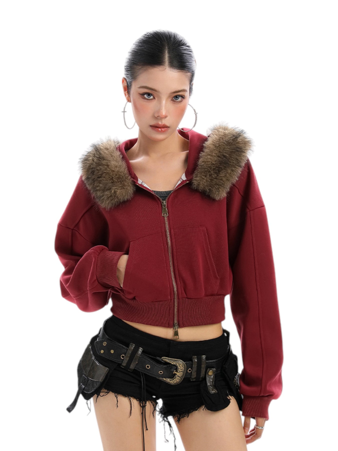 This cropped hoodie blends urban attitude with a winter-ready edge—featuring a plush faux fur trim that lines the hood for both warmth and fierce fashion. Its thick polyester build ensures structure while the cinched hem gives a flattering fit. Whether you’re layering up for cold days or showing out for street snaps, this hoodie brings the perfect mix of softness, sass, and style.