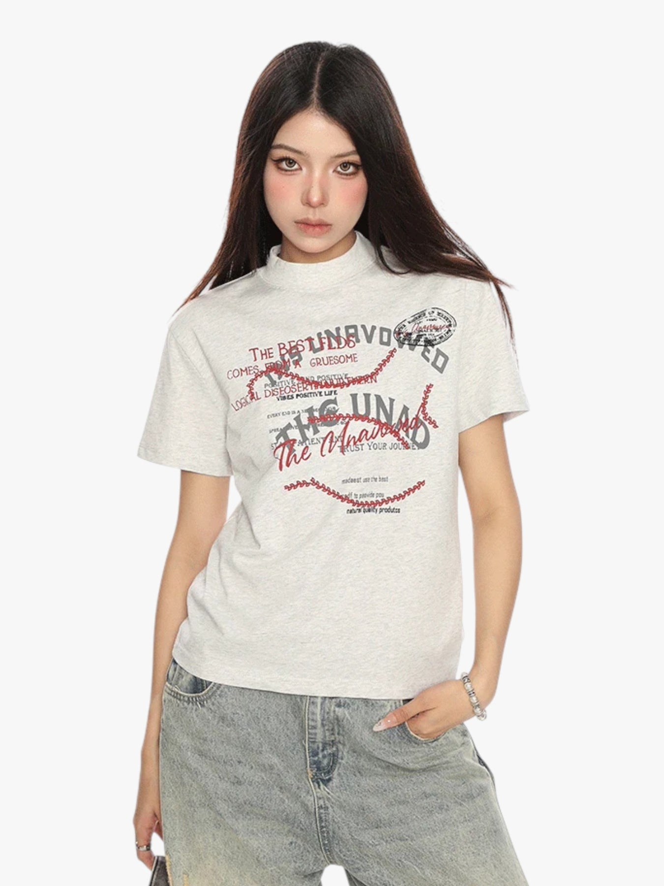 Stay effortlessly stylish with this graphic printed t-shirt. Featuring a trendy high neck and unique text print, it adds a touch of edgy charm to any casual look. Perfect for pairing with jeans or denim shorts for a laid-back vibe!