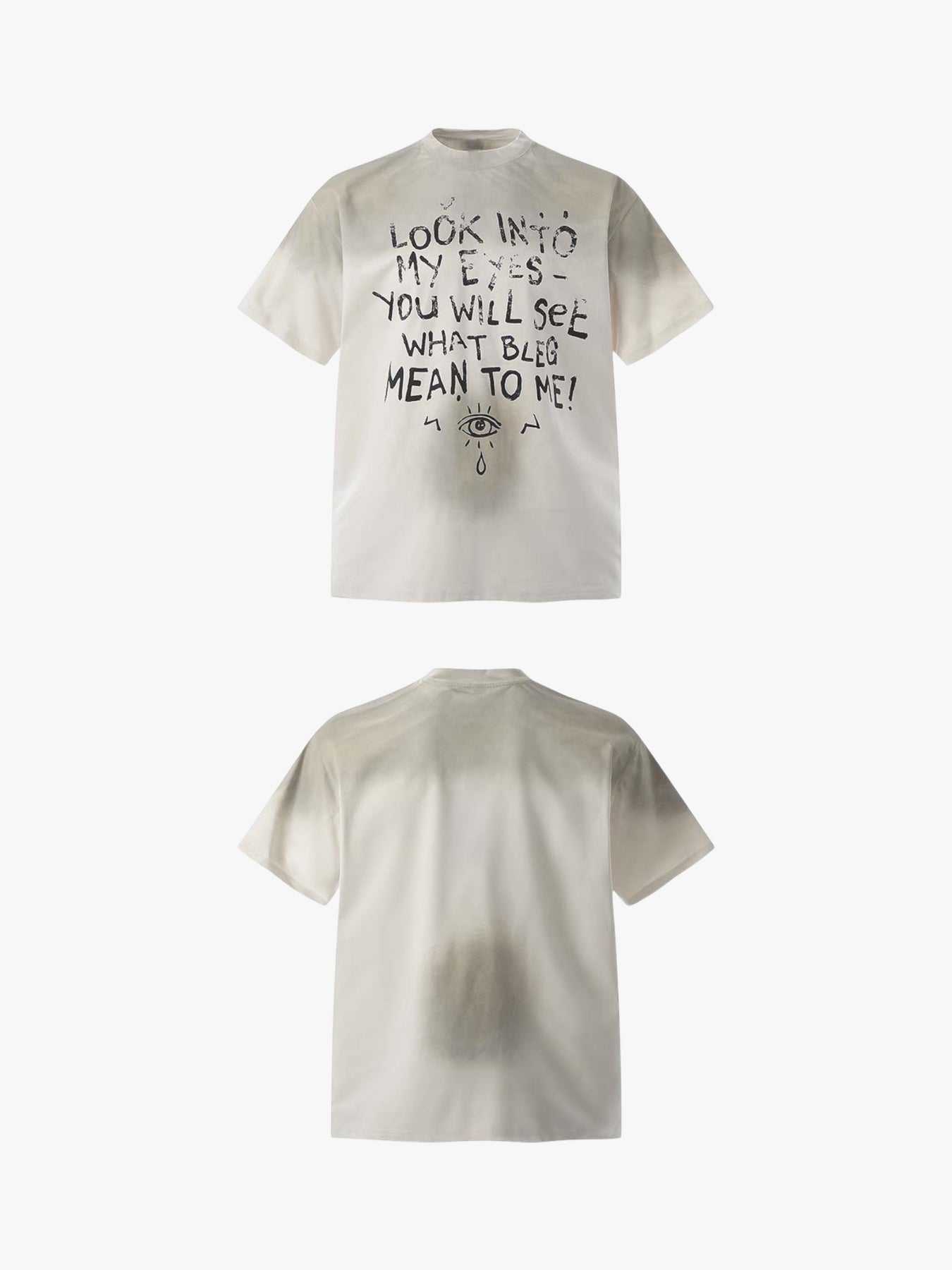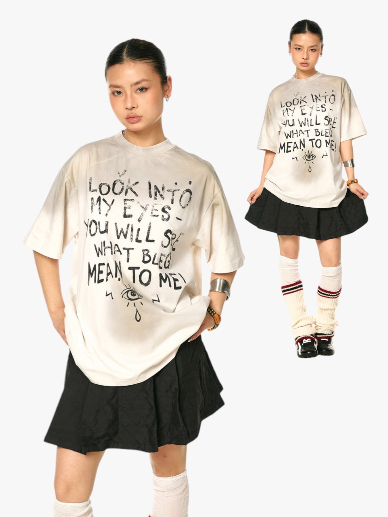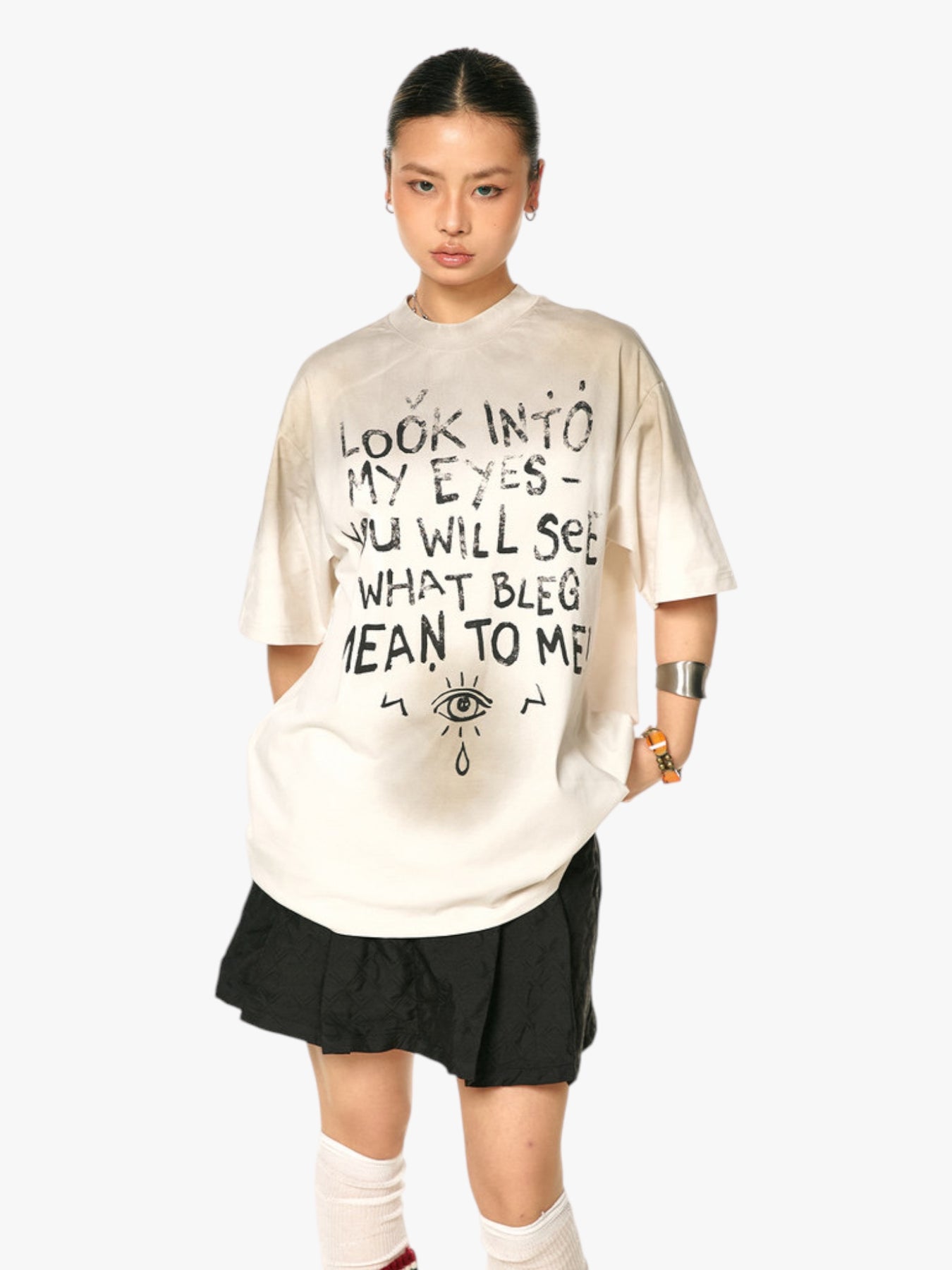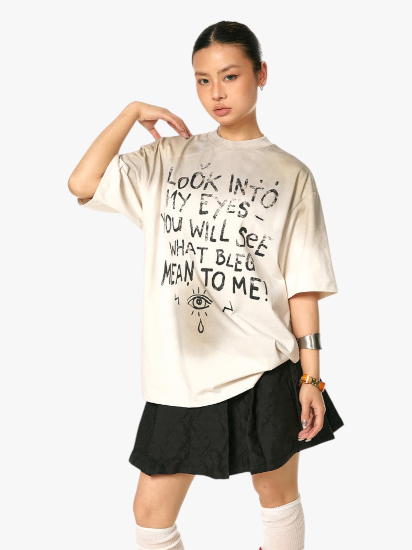Turn heads with a tee that speaks loud and clear. This oversized heavy cotton t-shirt is all about making a bold statement – both in comfort and attitude. Featuring a distressed dye effect and eye-catching handwritten-style typography that reads, “LOOK INTO MY EYES YOU WILL SEE WHAT BLEQ MEAN TO ME!” — this tee is a wearable piece of art.