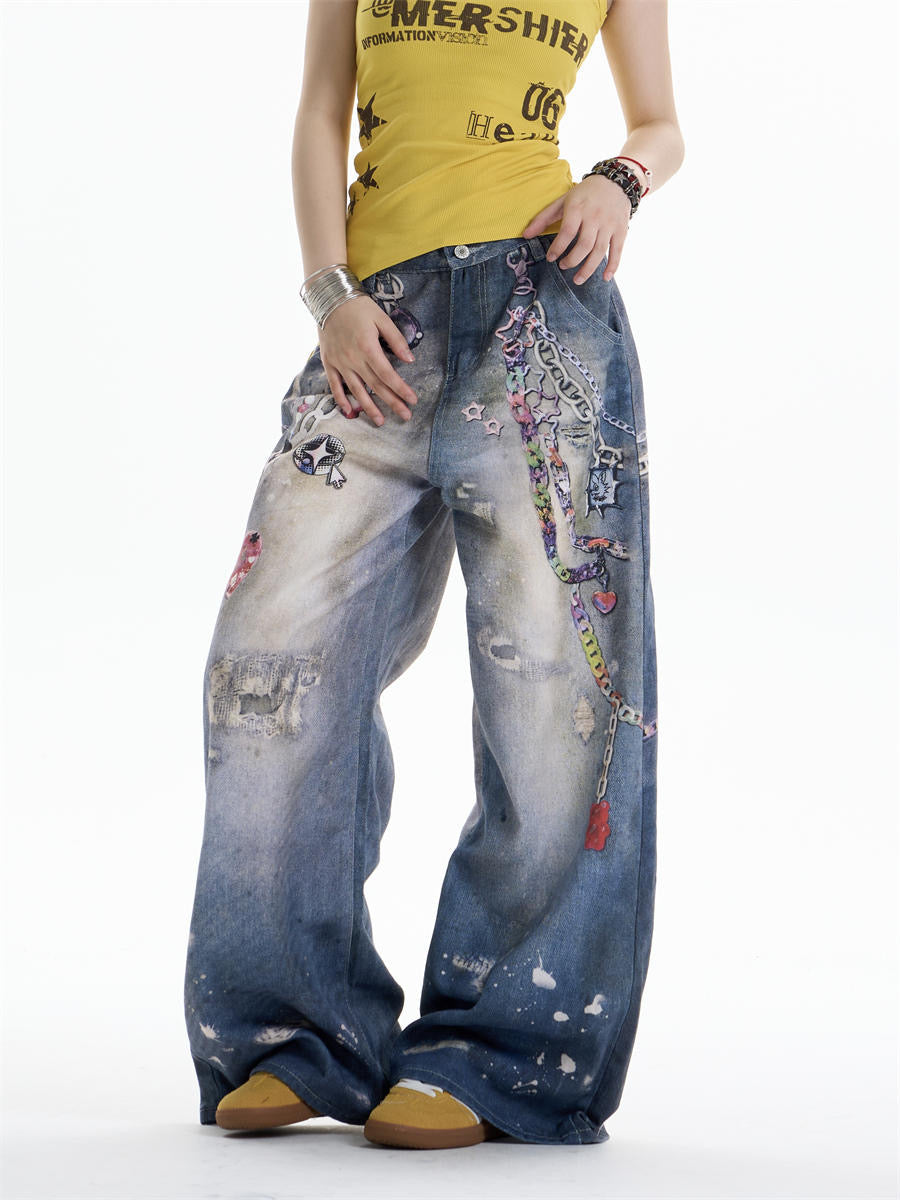 A bold fusion of art and attitude, the Chain-Realm Heavy Print Denim is your go-to for standing out. Made from heavyweight denim, it features an all-over graphic of chains, charms, and digital pop accents that wrap around both legs. The distressed wash and paint-splatter effect give it a vintage, worn-in vibe with high-impact visual depth. This piece is loud, rebellious, and unapologetically original.