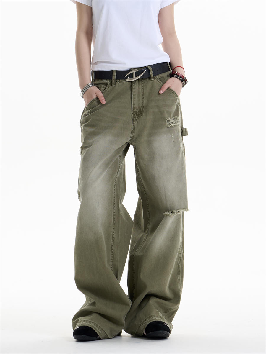 Step into bold style with the Dual Fade Ripstop Wide-Leg Denim. Designed with a vintage wash gradient that fades from dark to light, these jeans feature intentional distressing and frayed tear details for a rugged streetwear look. Crafted from durable heavyweight denim, they combine function and edge—ideal for making a statement in any setting. Available in blackout grey and military green tones.