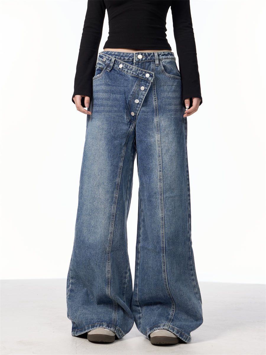 Elevate your casual denim game with these asymmetrical button-up wide-leg jeans. Crafted from high-quality denim, these jeans feature a unique overlapping button closure, adding a bold and contemporary touch to your outfit. Perfect for effortless everyday wear.