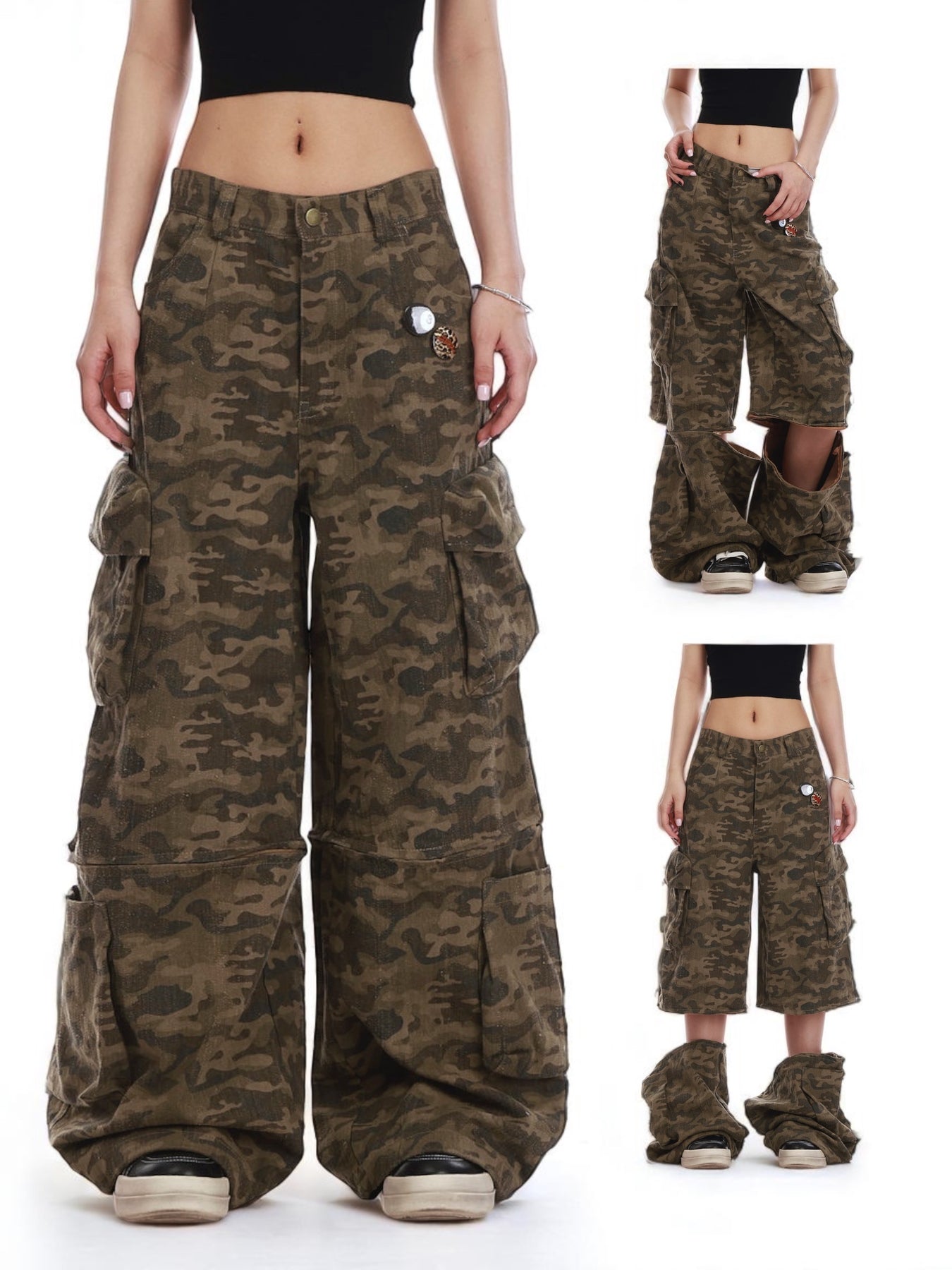 Made from breathable 100% cotton, these camo cargos are built for comfort and versatility. With detachable leg panels, you get three styles in one—full-length pants, knee-length shorts, or an undone stacked look. Functional pockets, a relaxed baggy fit, and a rugged camo print make them your go-to utility essential.