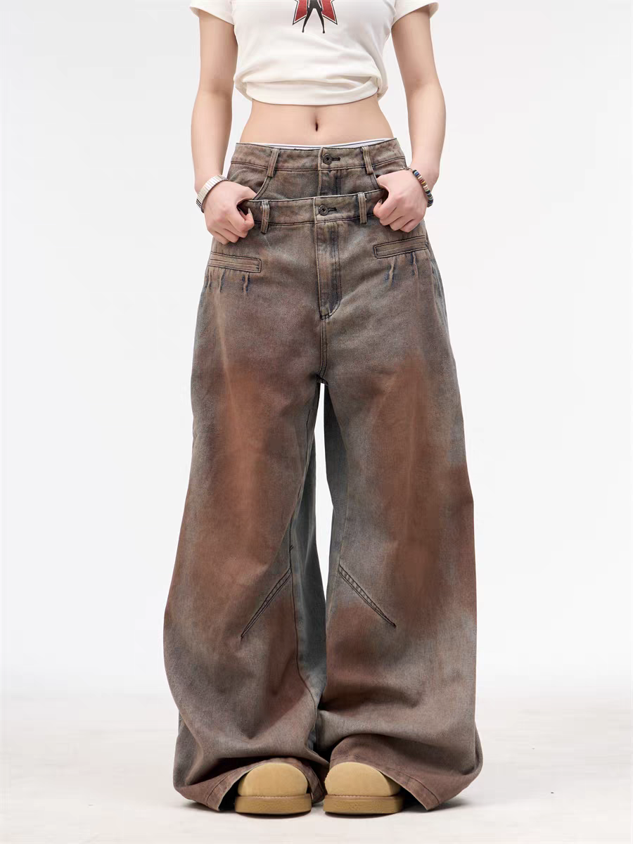 Step into standout streetwear with these Double Waistband Vintage Gradient Jeans. Featuring a unique dual-waist illusion and a washed-out gradient blend of muted brown and grey tones, these pants bring a rugged, deconstructed vibe to any fit. Designed with wide legs, faux front welt pockets, and oversized back pockets, they combine comfort and edge in one statement piece. Perfect for elevating your everyday style or pairing with a cropped top for a bold Y2K-inspired look.