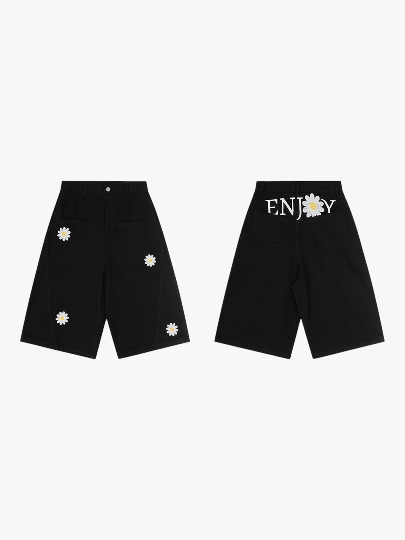 Step into effortless summer vibes with the “Enjoy Daisy Embroidered Wide-Leg Jorts.” Crafted from 100% pure cotton, these jorts combine comfort with style in a breezy, knee-length cut. The charming daisy embroidery on the front adds a touch of playful elegance, while the bold “ENJOY” lettering on the back brings an edge to the design. Perfect for pairing with crop tops or oversized tees, these jorts are your new go-to for casual outings and streetwear flair.