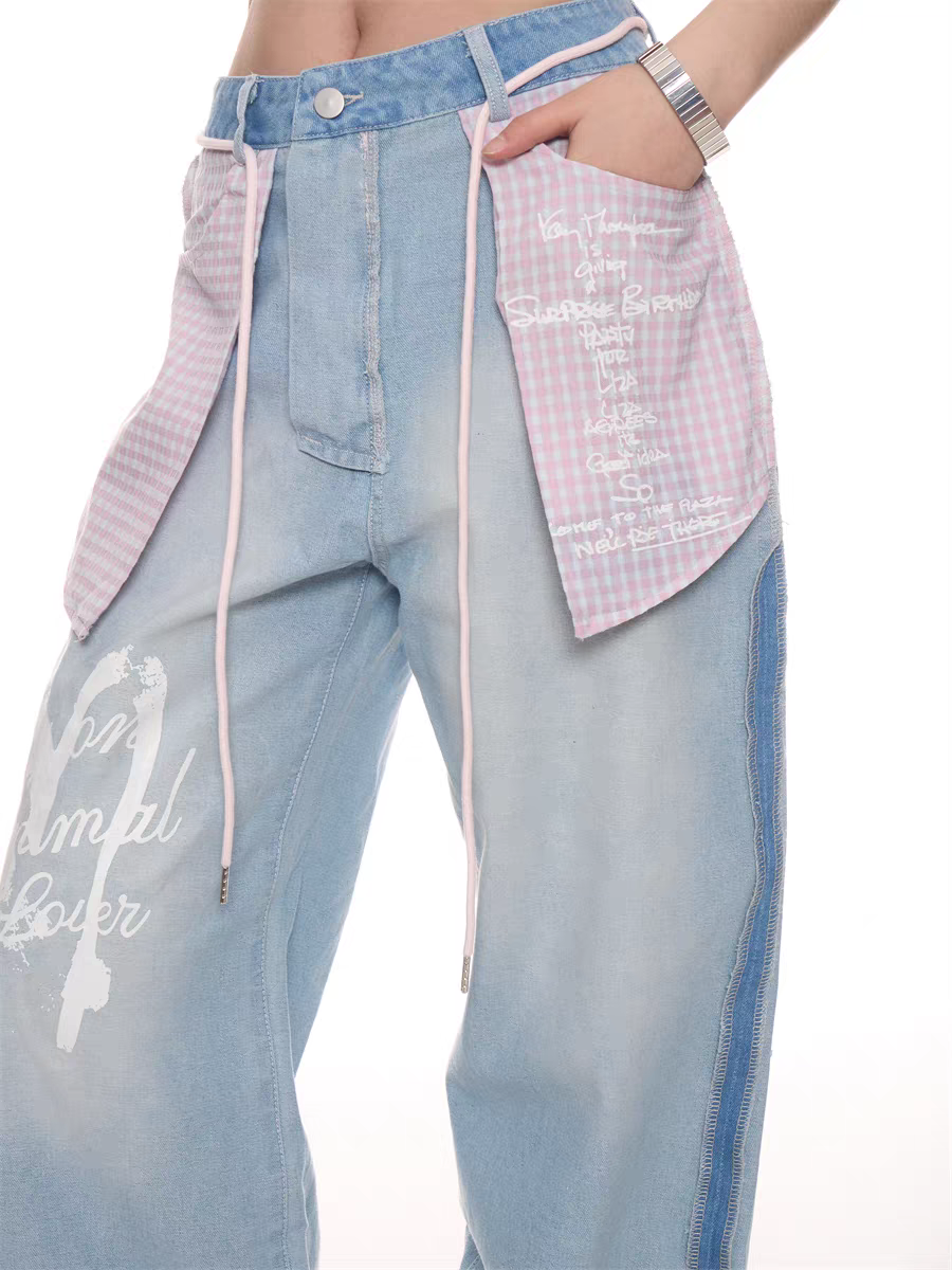 Unleash your playful side with the Pastel Rebel Wide-Leg Jeans. Crafted from faded light-wash denim with contrast patch pockets and gingham fabric drapes at the front, these pants mix sweet and rebellious energy like no other. Featuring a relaxed ultra-baggy silhouette, drawstring accents, and a 'Heartbreaker Lover' graphic print, they’re made for those who don't do boring. Soft, durable, and dripping with attitude – these jeans bring major Y2K vibes with a twist. Perfect for making everyday fits way less basic.