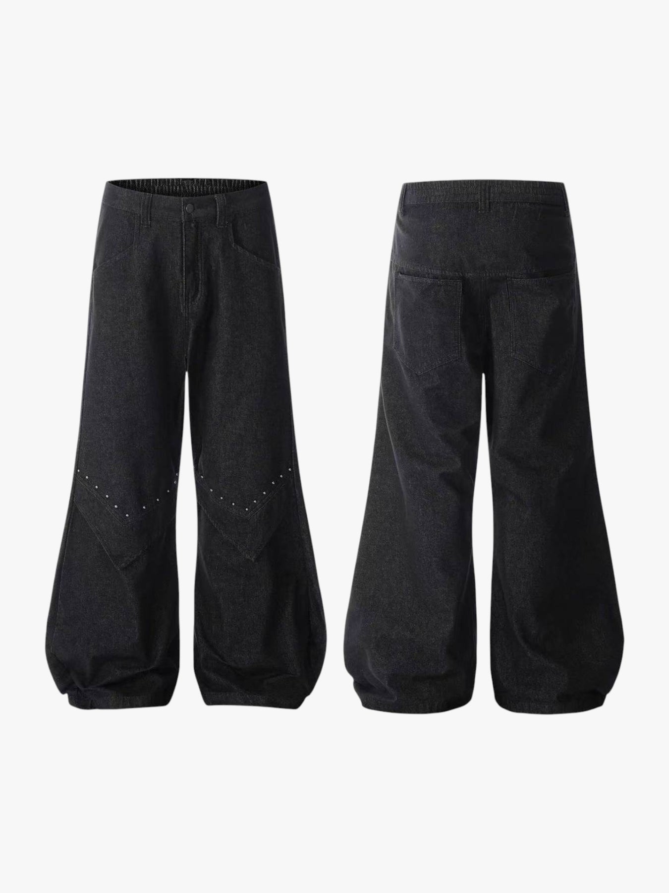 Step up your streetwear game with these edgy black wide-leg denim pants. Featuring a unique baggy silhouette with studded detailing, they bring a bold, vintage-inspired aesthetic. The loose fit and soft denim fabric ensure comfort, while the elastic waistband adds flexibility. Perfect for pairing with crop tops or oversized tees, these pants are a must-have for anyone looking to make a statement in urban fashion.