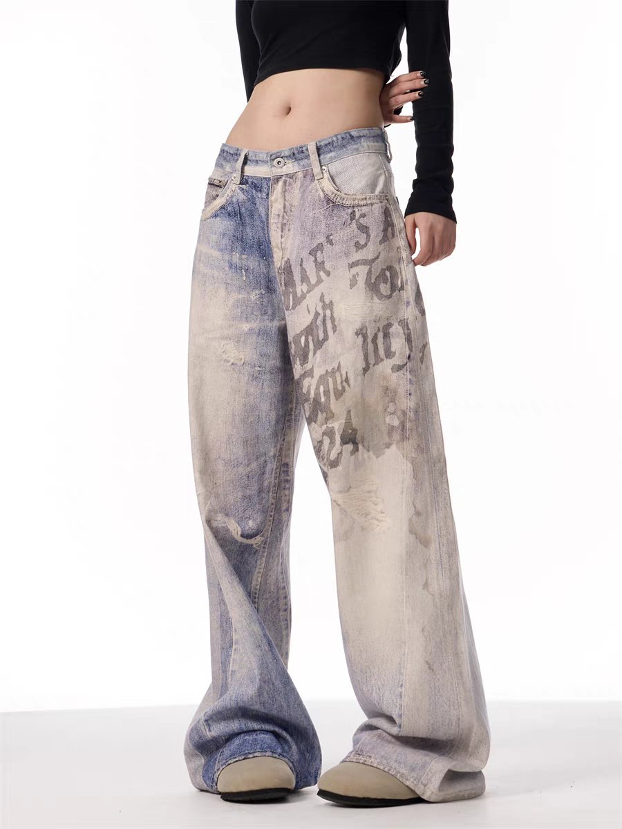 Stand out in these vintage washed wide-leg jeans featuring bold graffiti-style lettering and a bleached fade finish. The unique design blends streetwear vibes with distressed detailing, offering a worn-in aesthetic with modern edge. Crafted for comfort and style, these jeans bring effortless cool to any casual look.