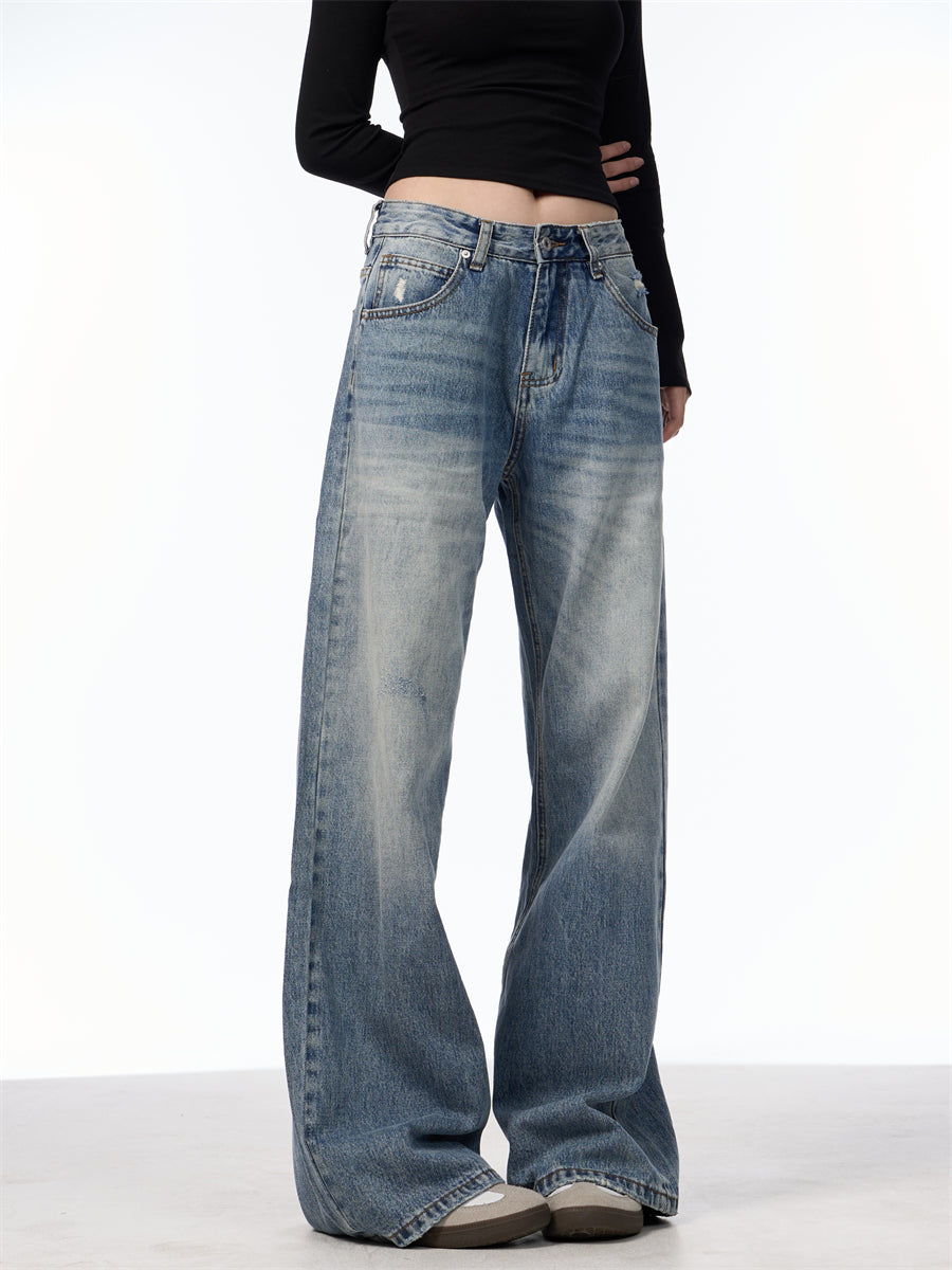 Crafted from premium denim, these high-waisted jeans feature a relaxed wide-leg fit and a classic faded wash for a timeless, versatile look. Perfect for pairing with crop tops or sweaters, they bring effortless style and all-day comfort.