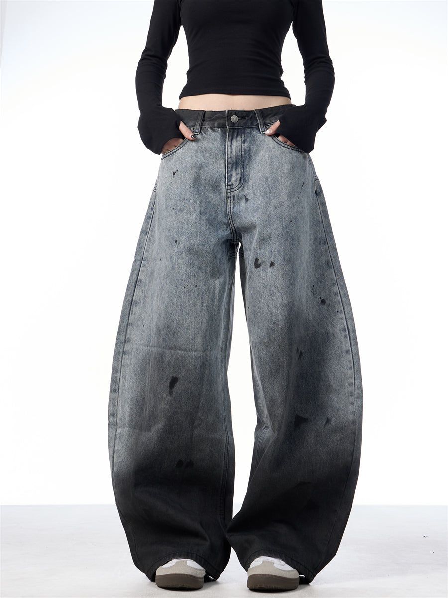 These washed jeans stand out with their unique splash-ink graffiti design. The loose silhouette and artistic detailing add a contemporary twist to traditional denim, making them a standout wardrobe piece.