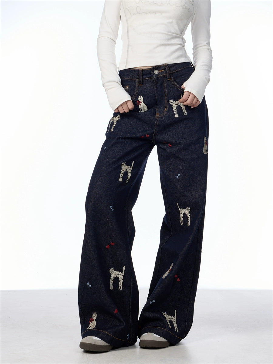 GKIKZ CHEW CHEW EMBROIDERED ANIMALS WIDE-LEG JEANS