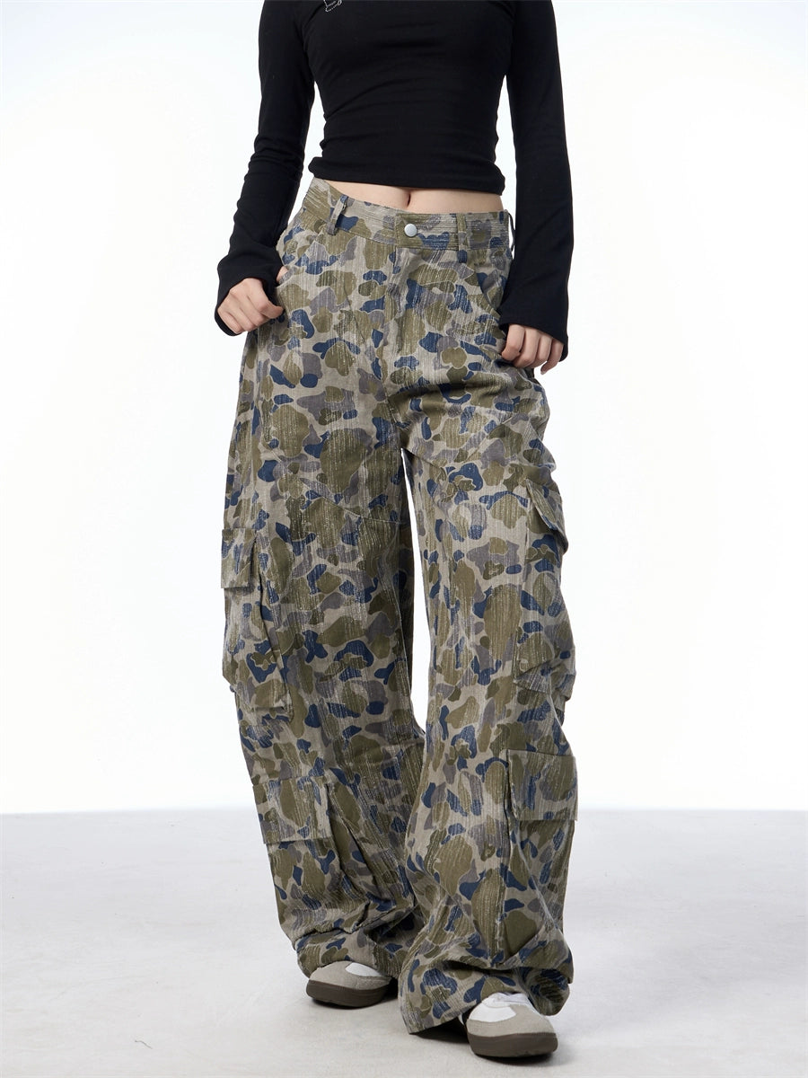 GKIKZ CAMOUFLAGE LARGE POCKET CARGO WIDE-LEG PANTS