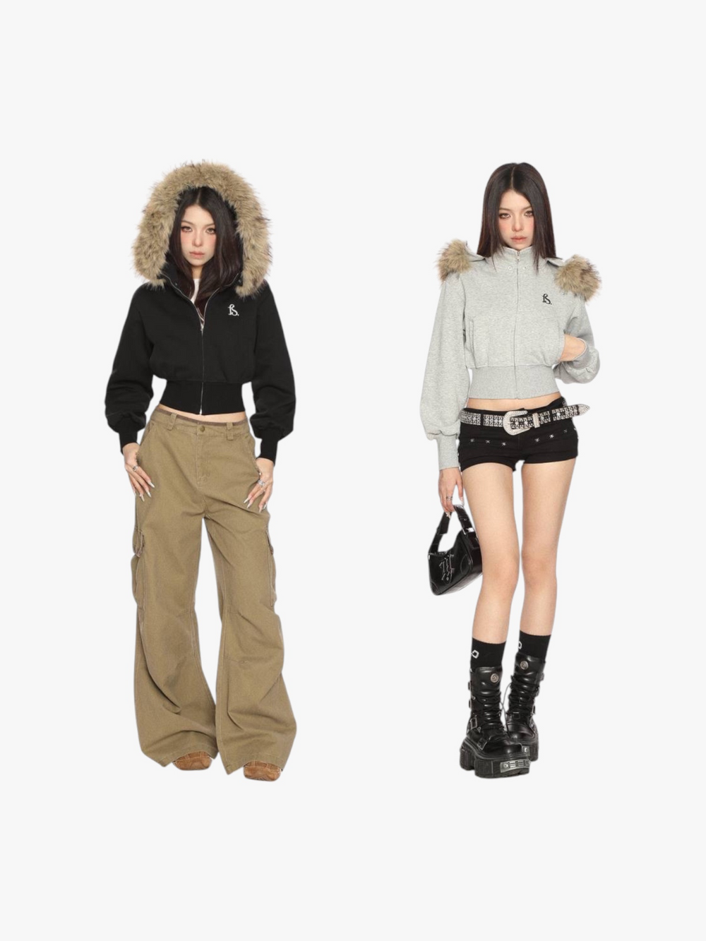 GKIKZ FAUX FUR CROPPED DETACHABLE HOOD ZIP-UP