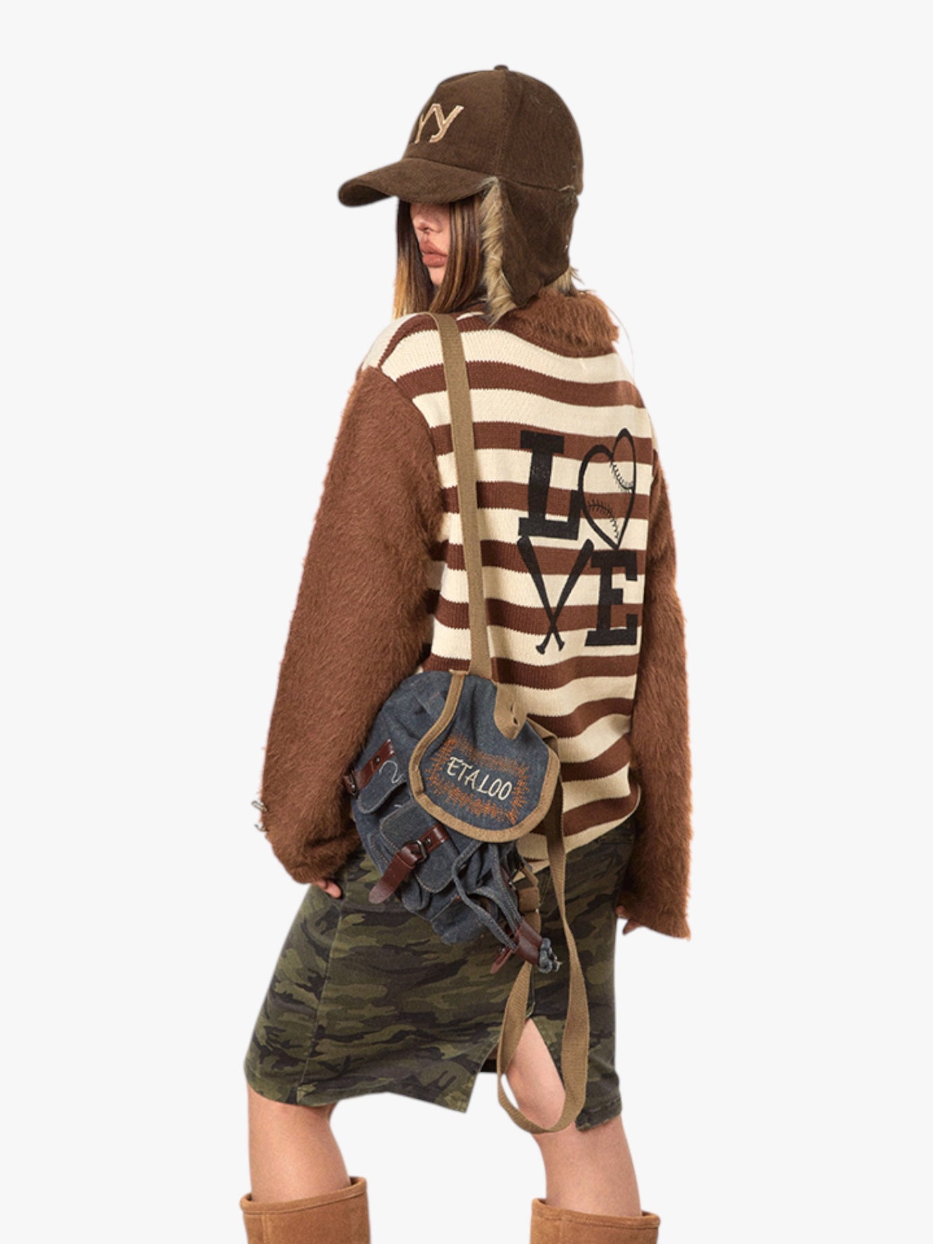 This striped sweater features a playful “LOVE” graphic on the back and cozy fuzzy sleeves for a bold and chic look. With its soft material and statement style, it’s perfect for adding personality to your casual wardrobe. Available in two versatile colorways: a warm brown combo and a classic black-and-white pairing.