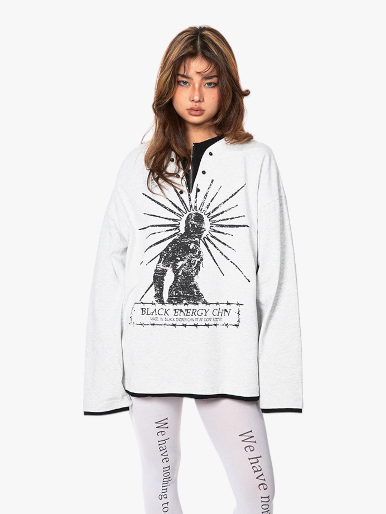 This oversized white pullover features a bold, artistic graphic print of “Black Energy” with edgy detailing. Designed for those who want to make a statement, it combines streetwear vibes with casual comfort. The loose fit ensures effortless style while maintaining a relaxed feel. Perfect for pairing with jeans, leggings, or joggers.