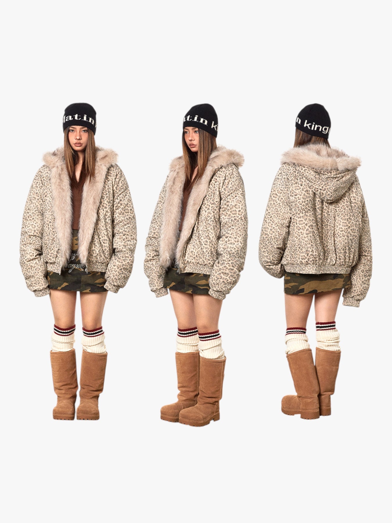 GKIKZ LUXURIOUS LEOPARD PRINT FAUX FUR HOODED JACKET