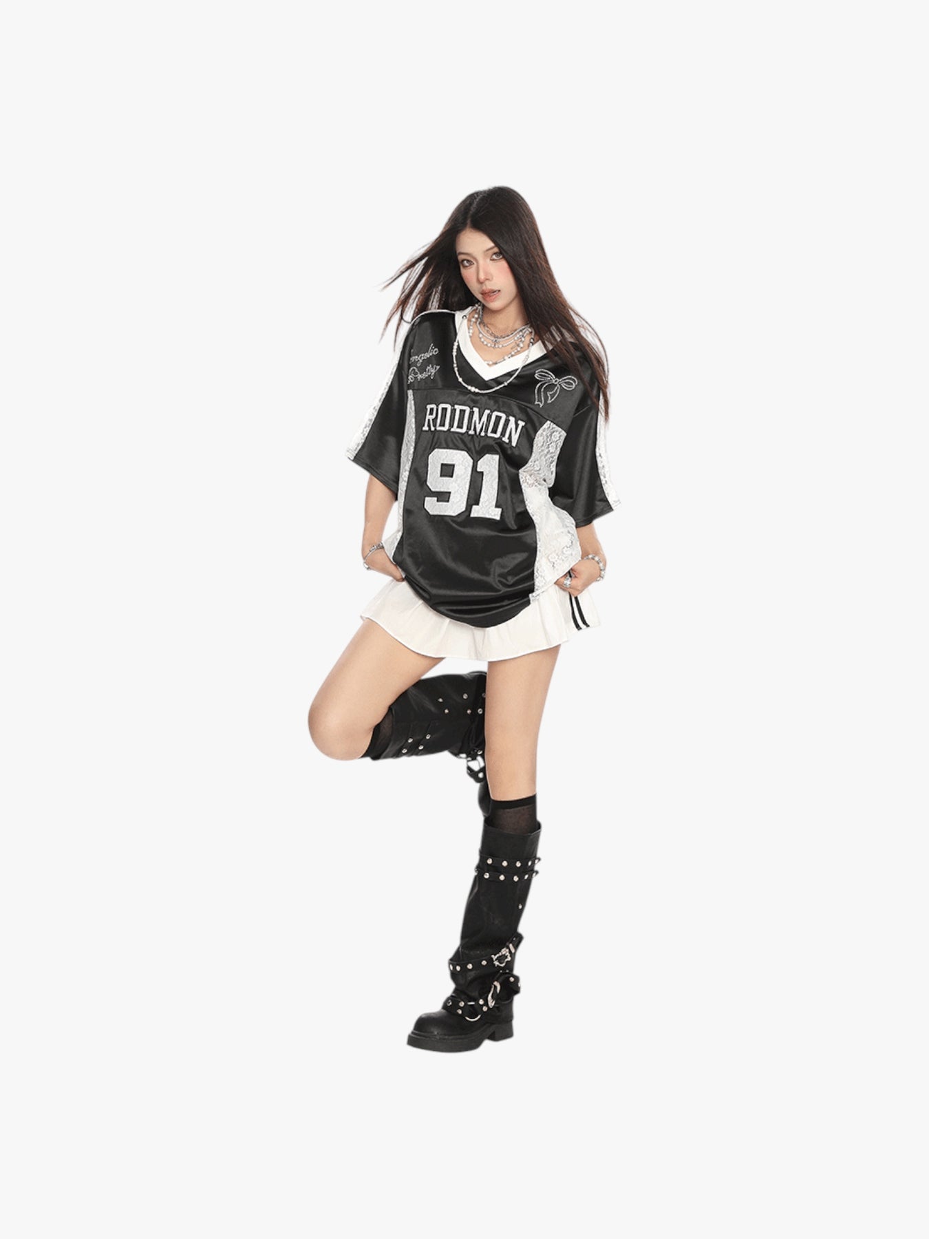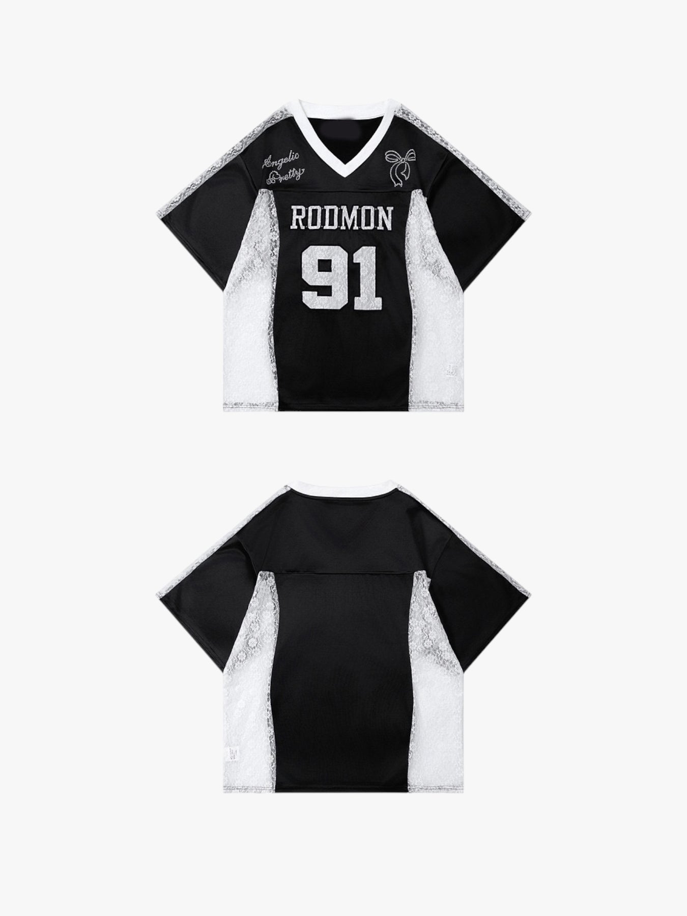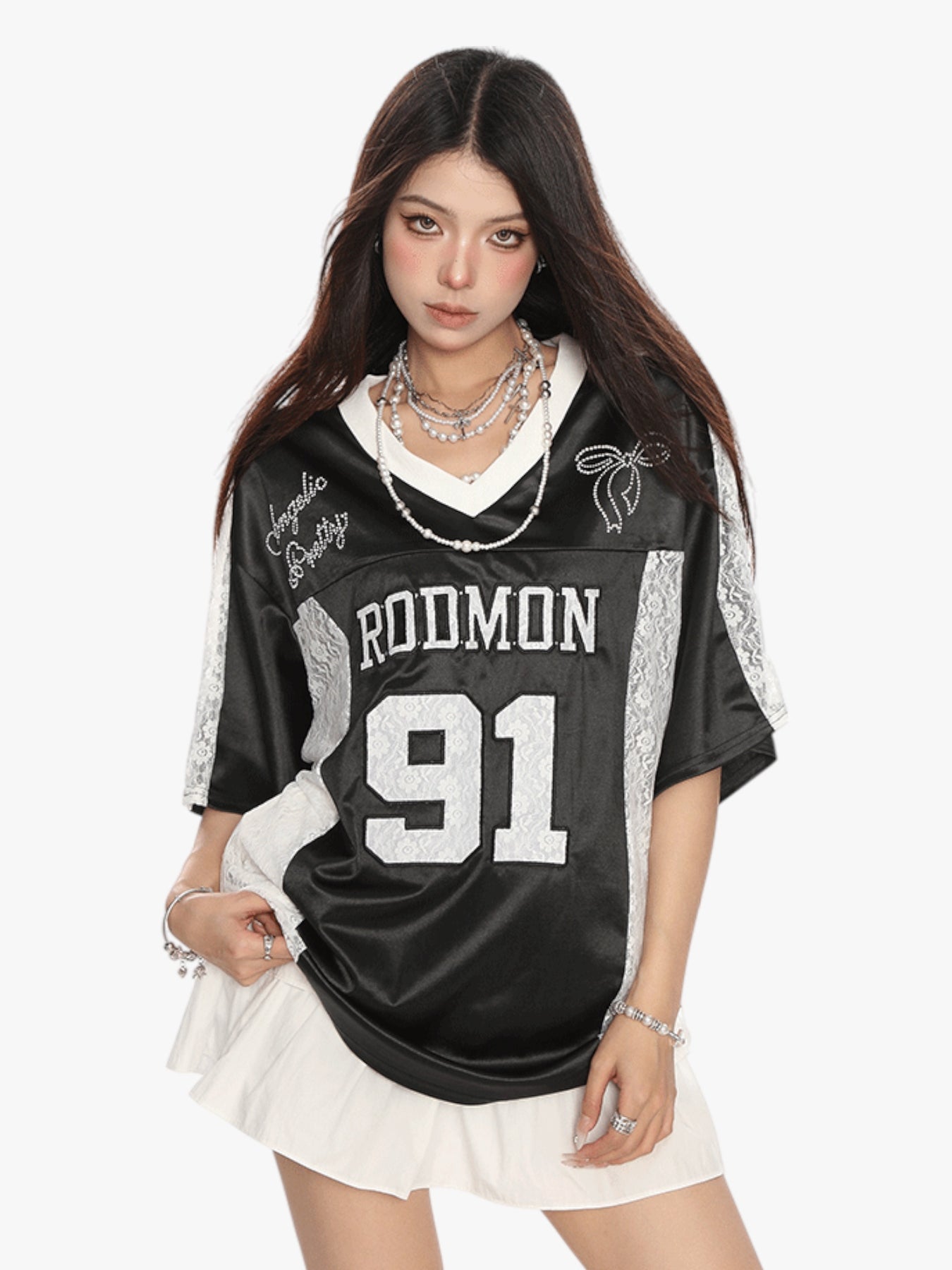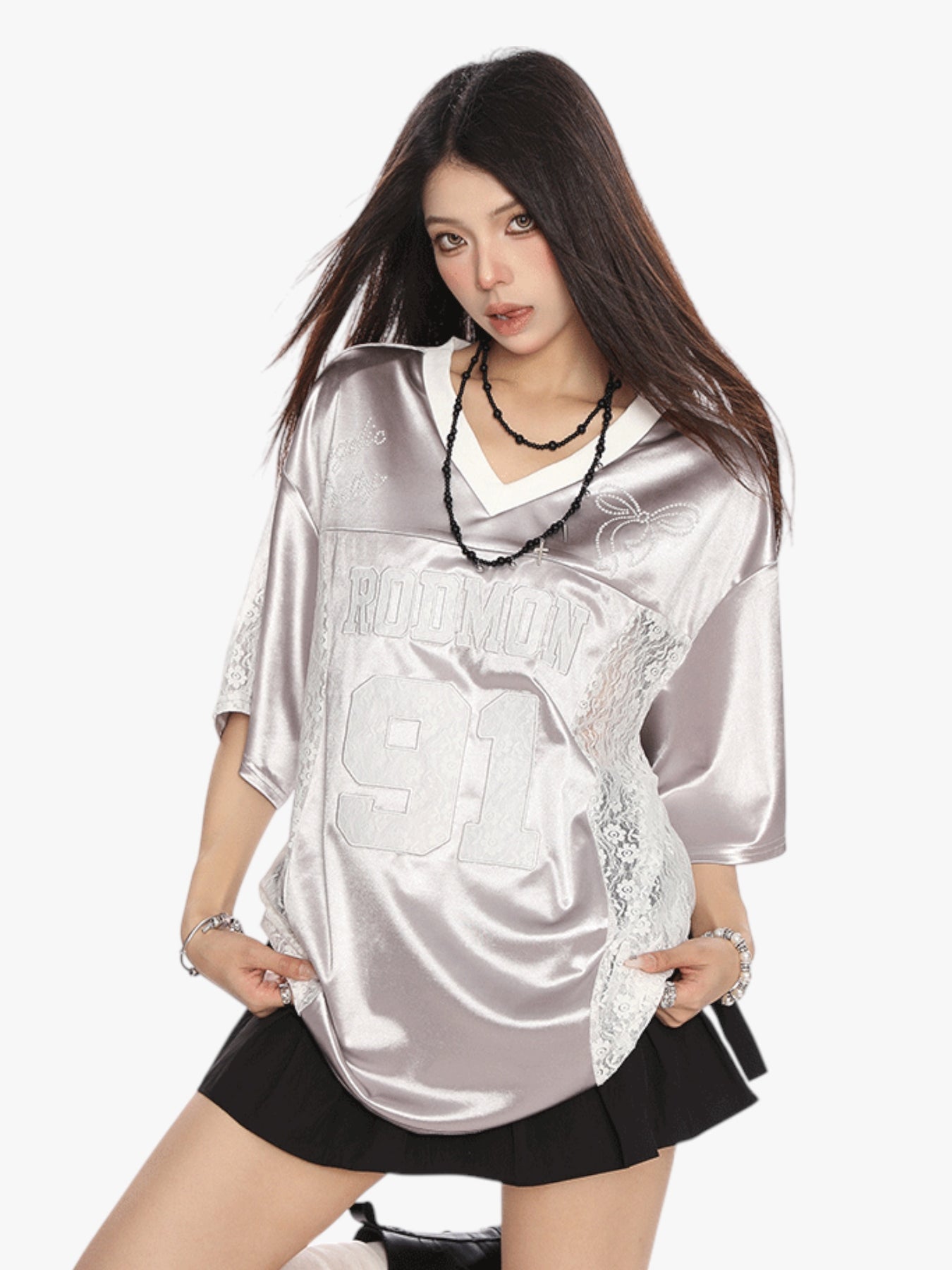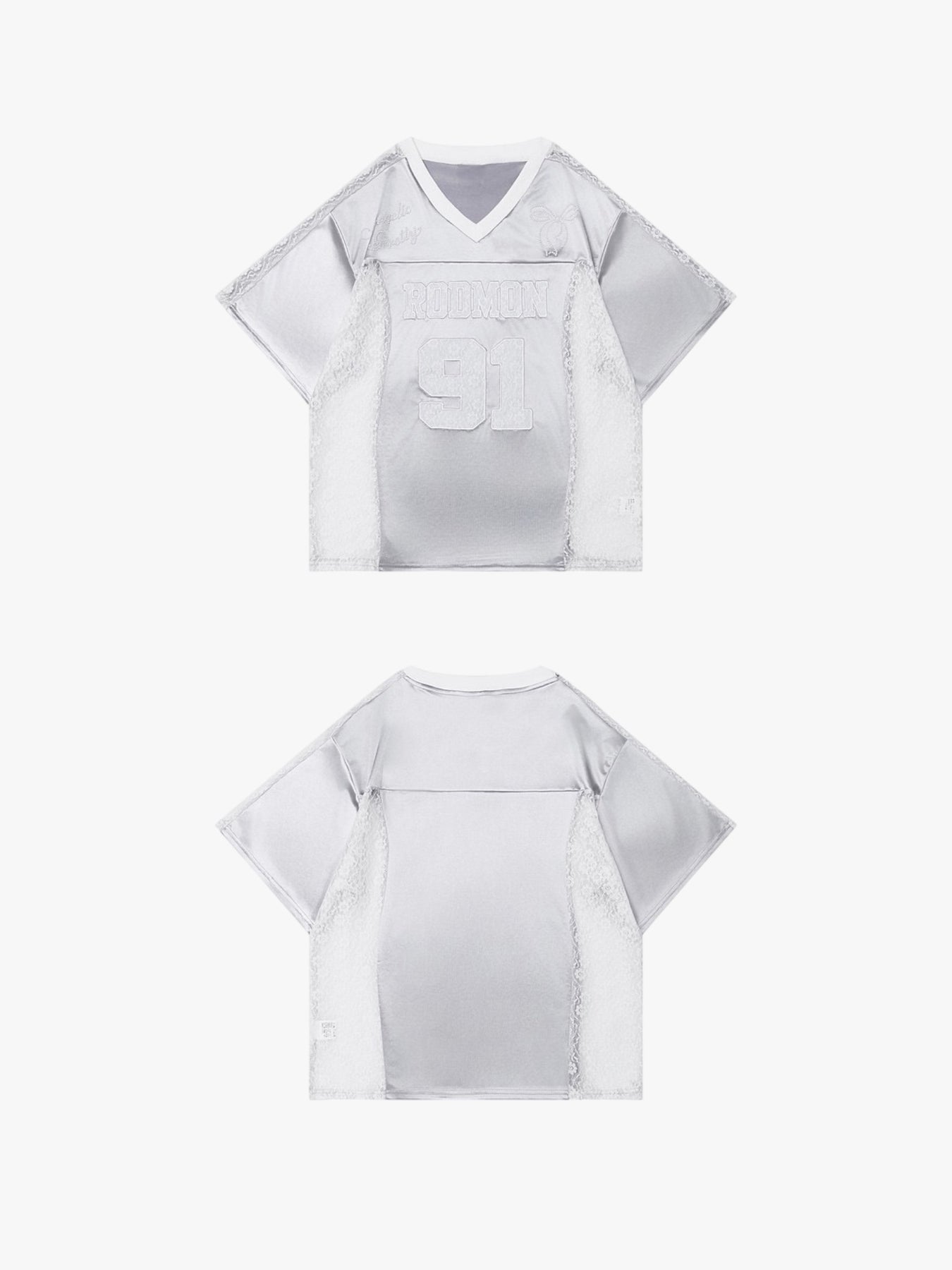 Channel sporty street vibes with this oversized jersey featuring bold “RODMON 91” lettering. The lace patchwork sides add a touch of edgy femininity, making it a standout piece for casual layering. Breathable satin-like fabric for all-day comfort with a luxe finish.