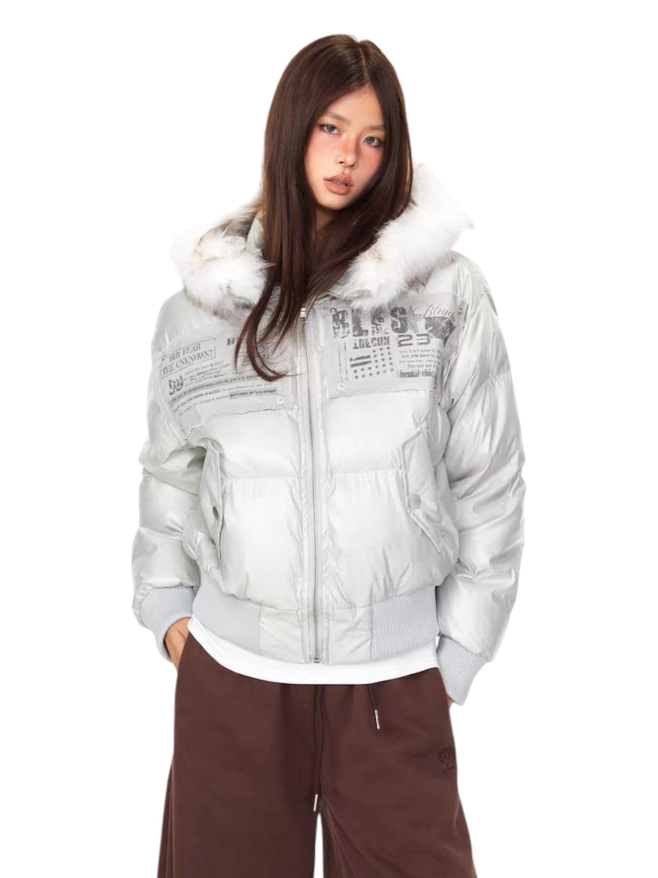 An ultra-cozy take on vintage streetwear. The Urban Archive Puffer is crafted from glossy polyester with bold text embroidery details across the chest and shoulders, echoing retro-inspired codes. Featuring a removable faux fur-trimmed hood and a cinched elastic hem and cuffs, this jacket brings both functionality and edge. Oversized fit with a drop shoulder structure adds effortless volume. Whether you’re layering it over sweats or pairing with cargos, this jacket is designed to make a winter statement.
