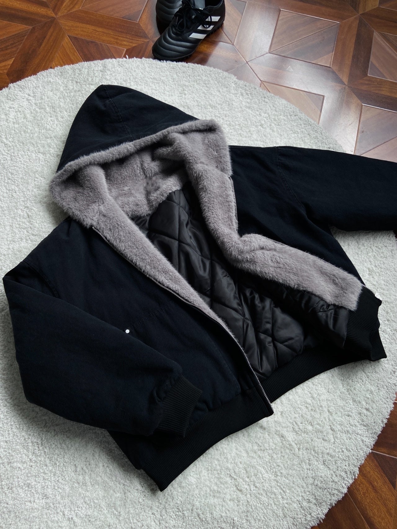 This winter-thick faux fur bomber jacket is designed for ultimate comfort and warmth. Featuring a plush, soft fur lining and quilted interior, it provides cozy insulation for chilly days. With ribbed cuffs and hem for a snug fit and a classic hooded design, this jacket is both stylish and functional. Perfect for staying warm while elevating your winter wardrobe.