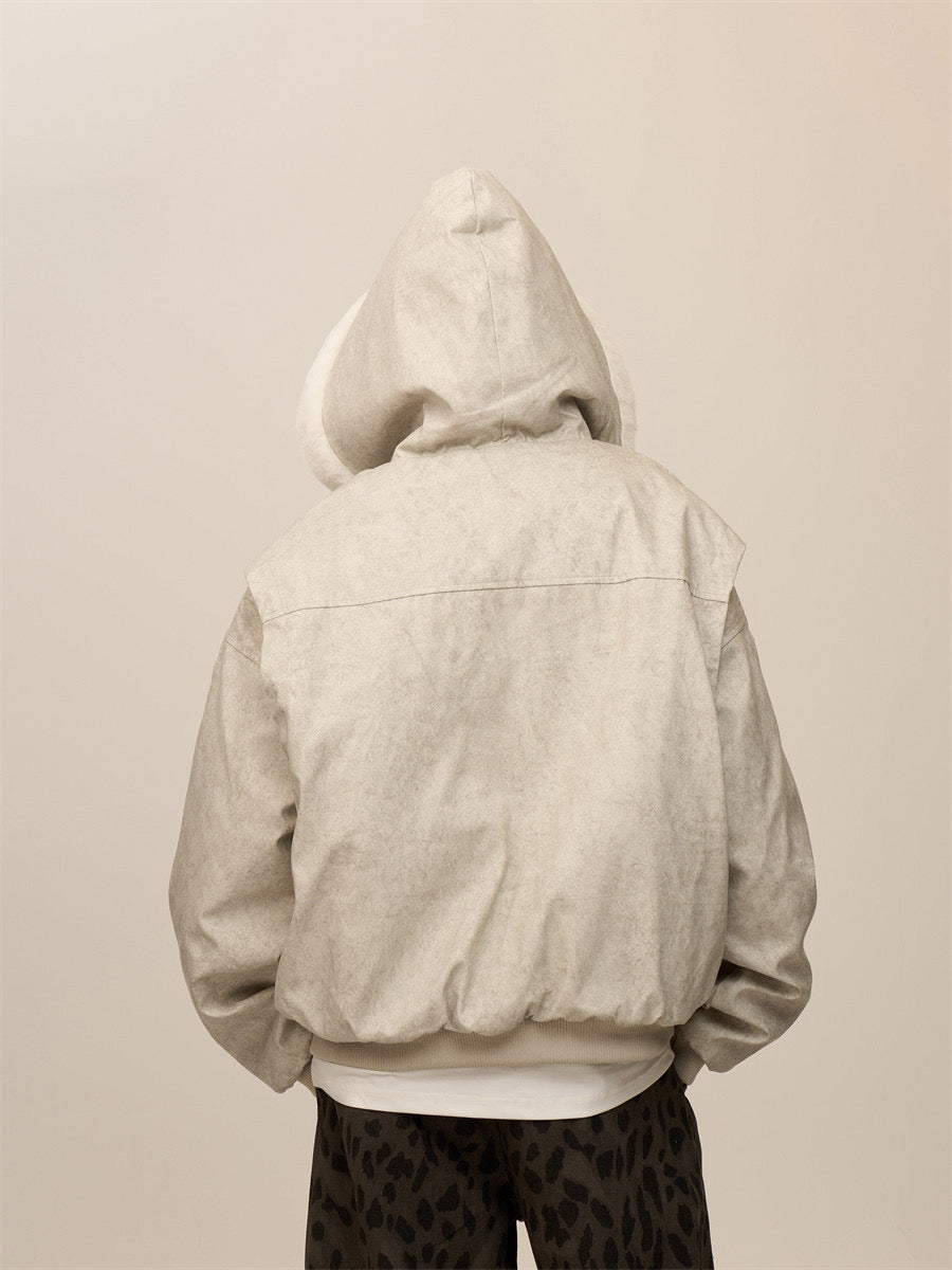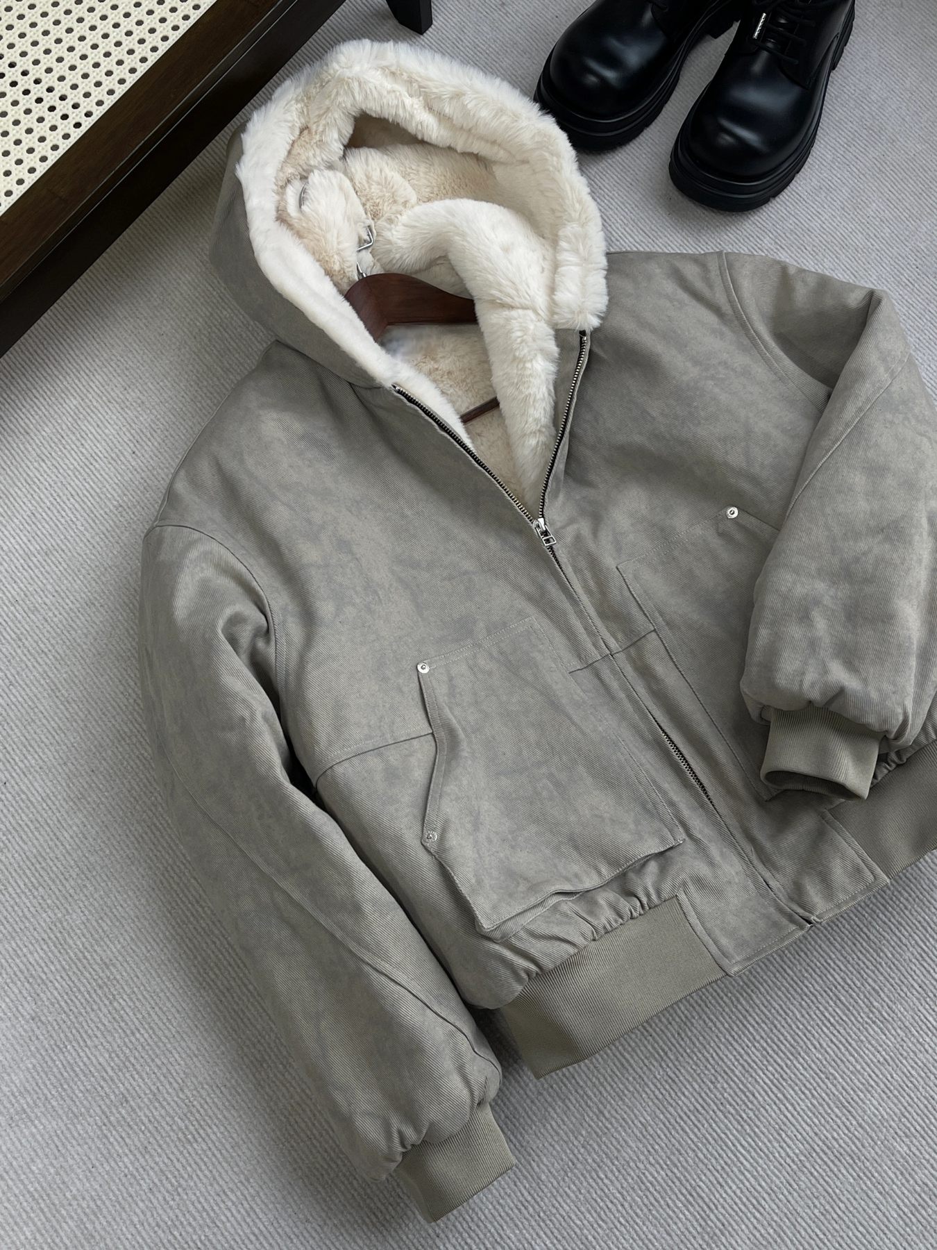 Elevate your winter collection, meticulously designed for both style and warmth. This unisex piece combines a luxe, suede-like exterior in a soothing neutral tone with a sumptuous sherpa lining, perfect for chilly days. The jacket features an oversized hood that lends a modern edge to its overall design.