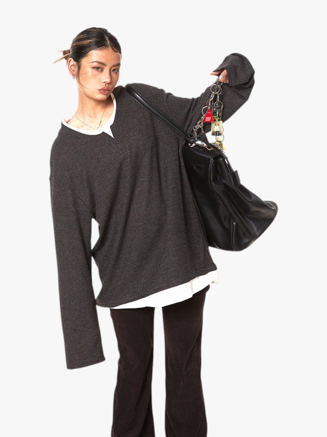 GKIKZ TEXTURE FAKE TWO-PIECE OVERSIZED KNIT TEES