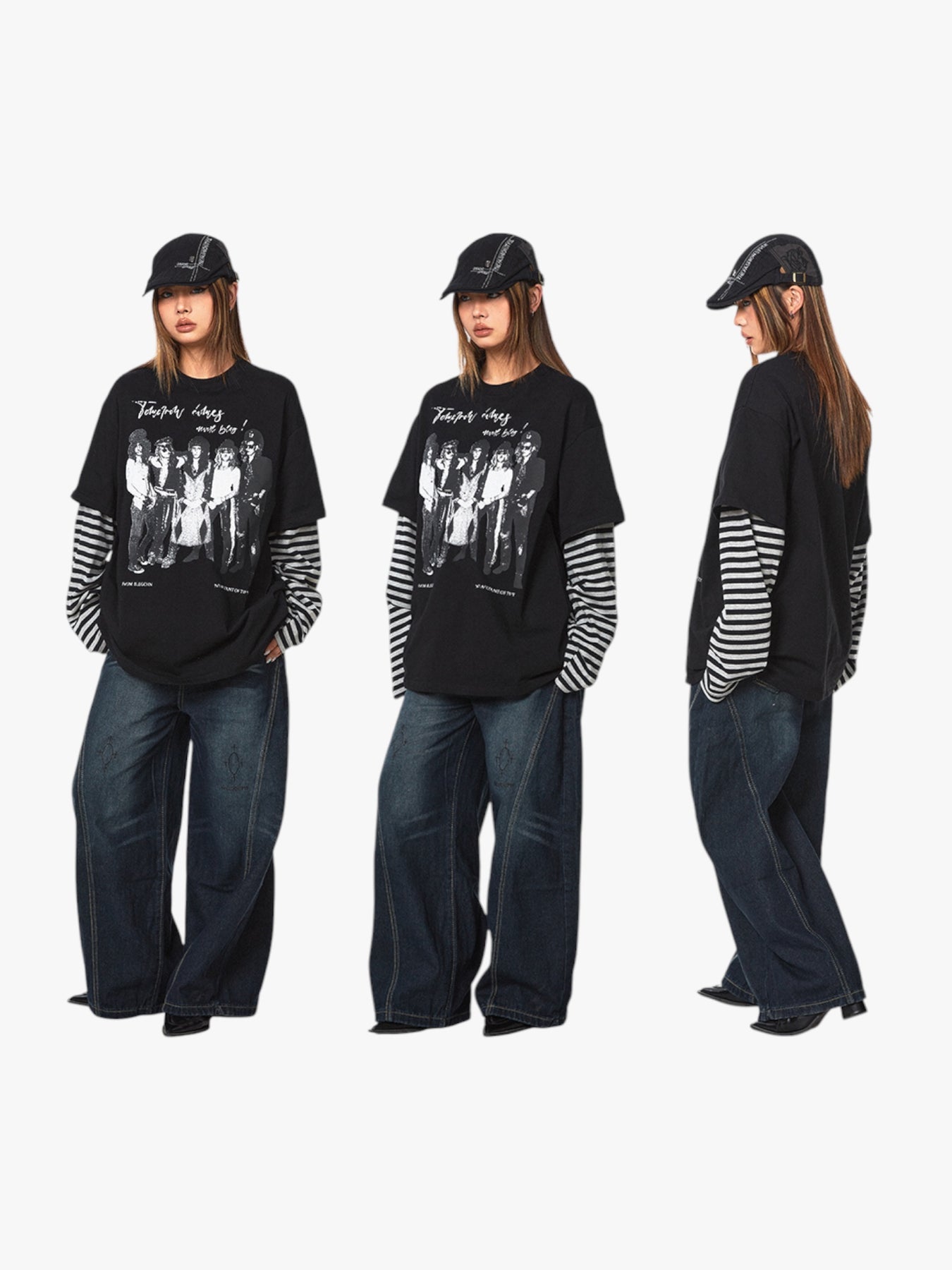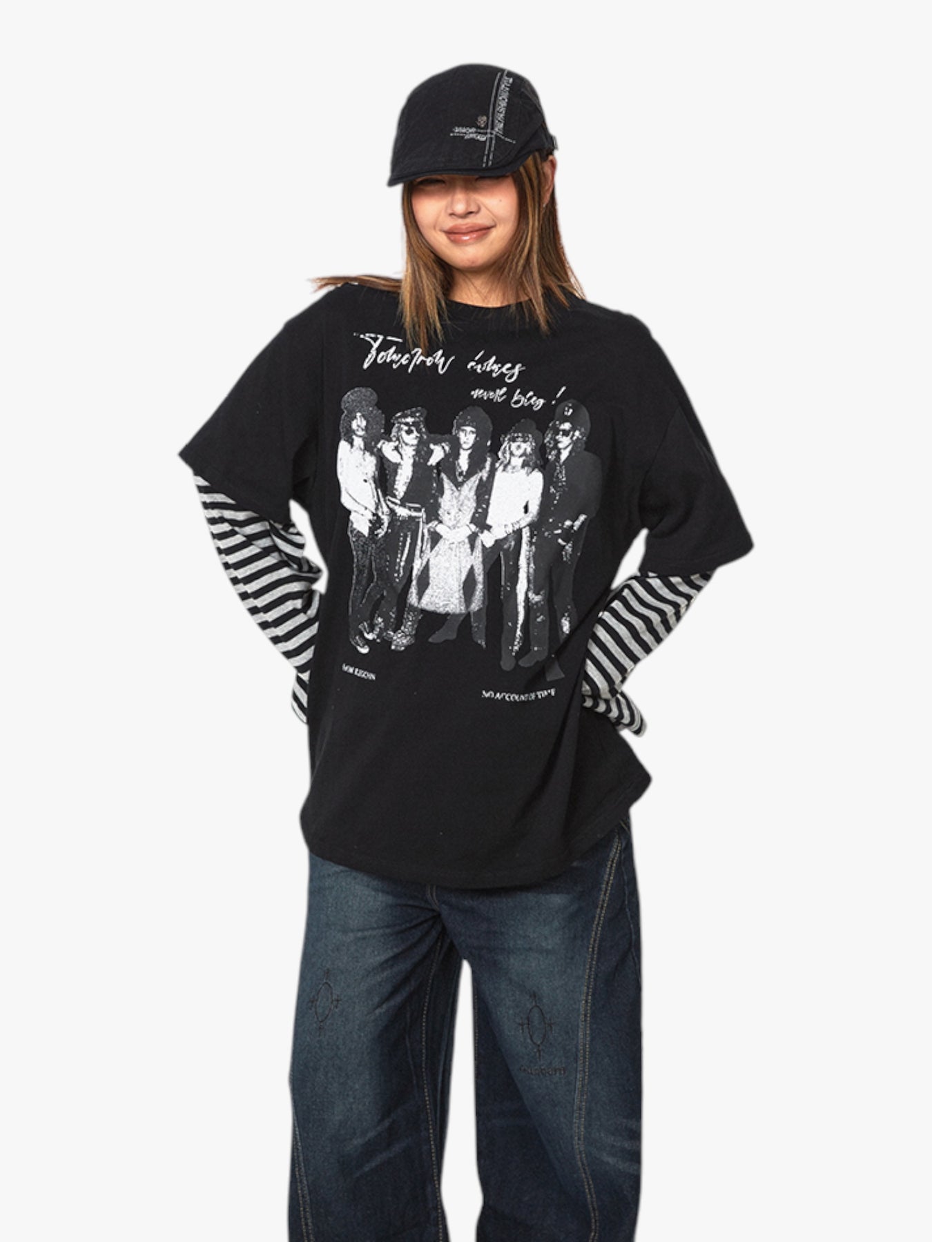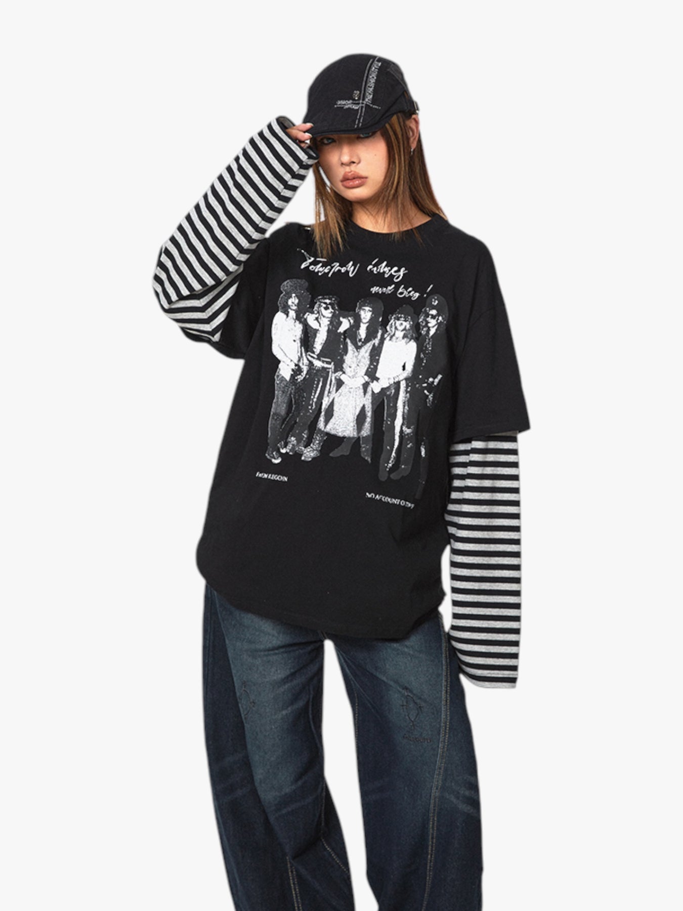 Rock the vintage grunge look with this 100% cotton graphic tee! Featuring a bold print of a rock band and layered striped sleeves, this oversized tee gives off effortless streetwear vibes. Soft, breathable, and perfect for everyday wear!