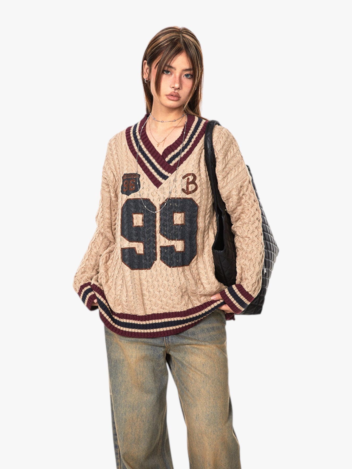 The sweater features a preppy design with a textured knit and prominent “99” varsity-style numbering on the front. Accentuated with a striped V-neckline and matching hem details, it offers a vintage collegiate vibe. The loose fit and cable-knit construction make it cozy and stylish for casual outings. Available in two versatile shades, it complements a range of looks effortlessly.