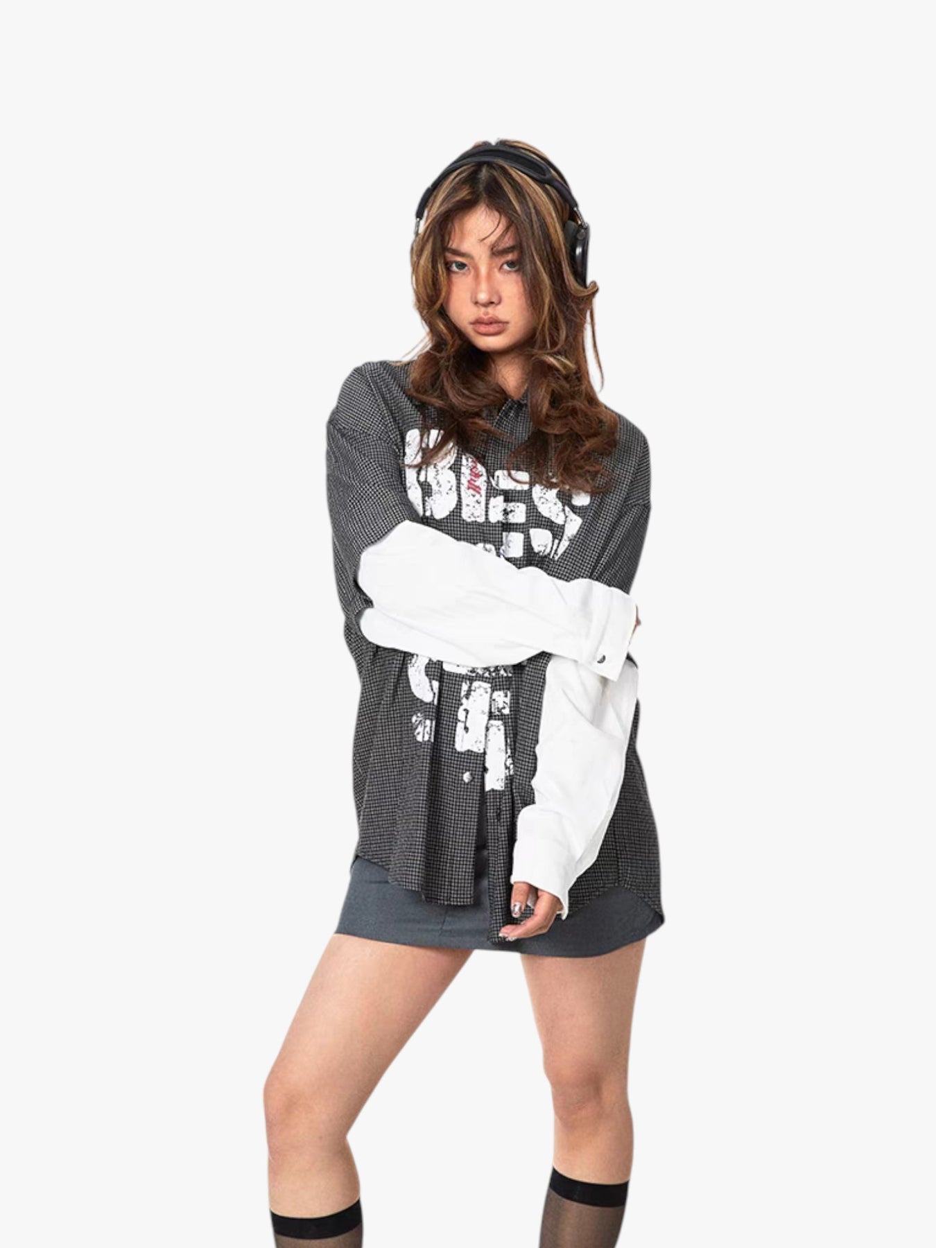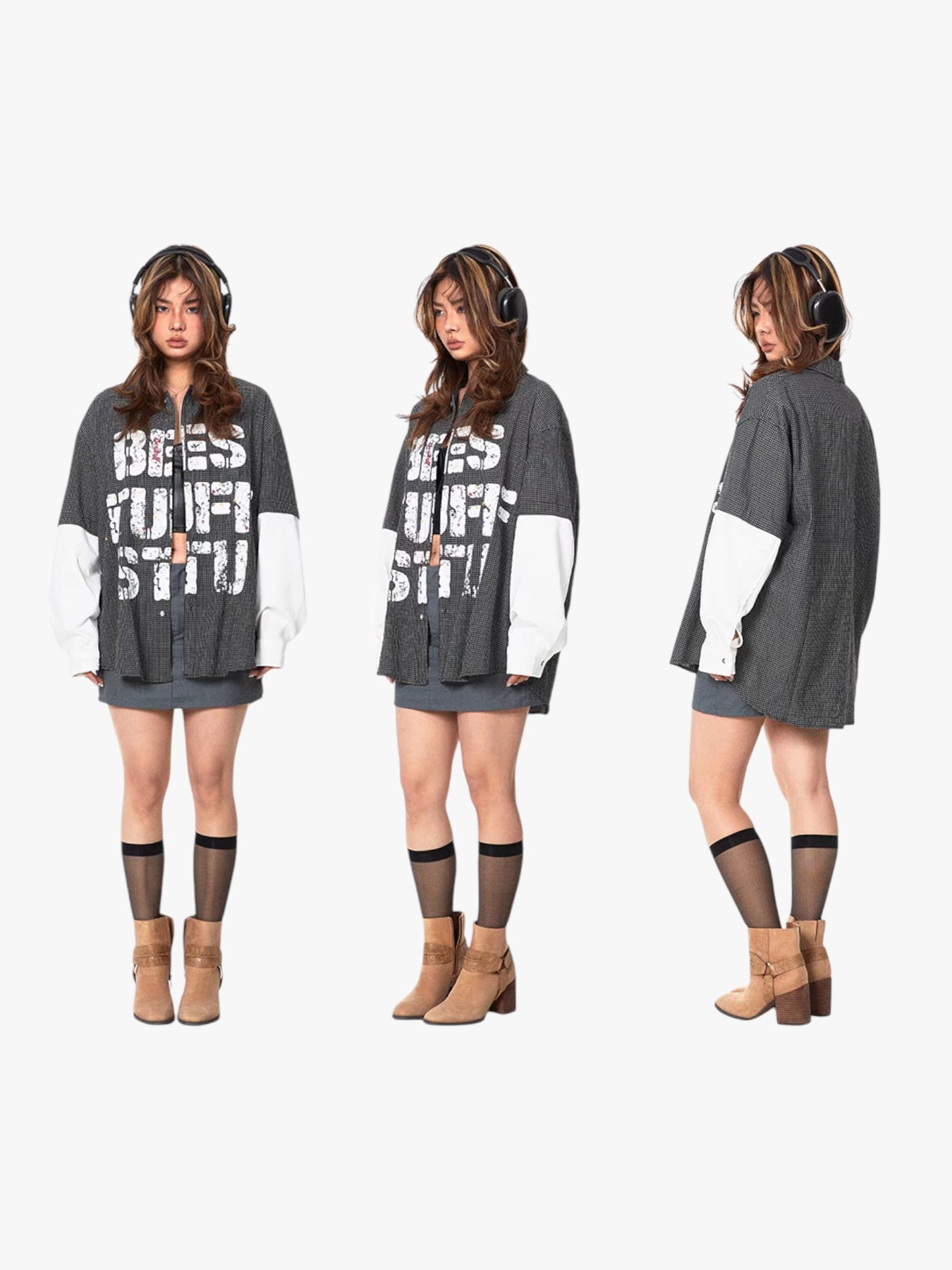This oversized plaid shirt combines edgy street style with a contemporary aesthetic, featuring bold typography on the front and contrasting white sleeves for a unique layered look. Made from a comfortable and breathable fabric, it’s perfect for layering over casual fits or styling as a statement piece.
