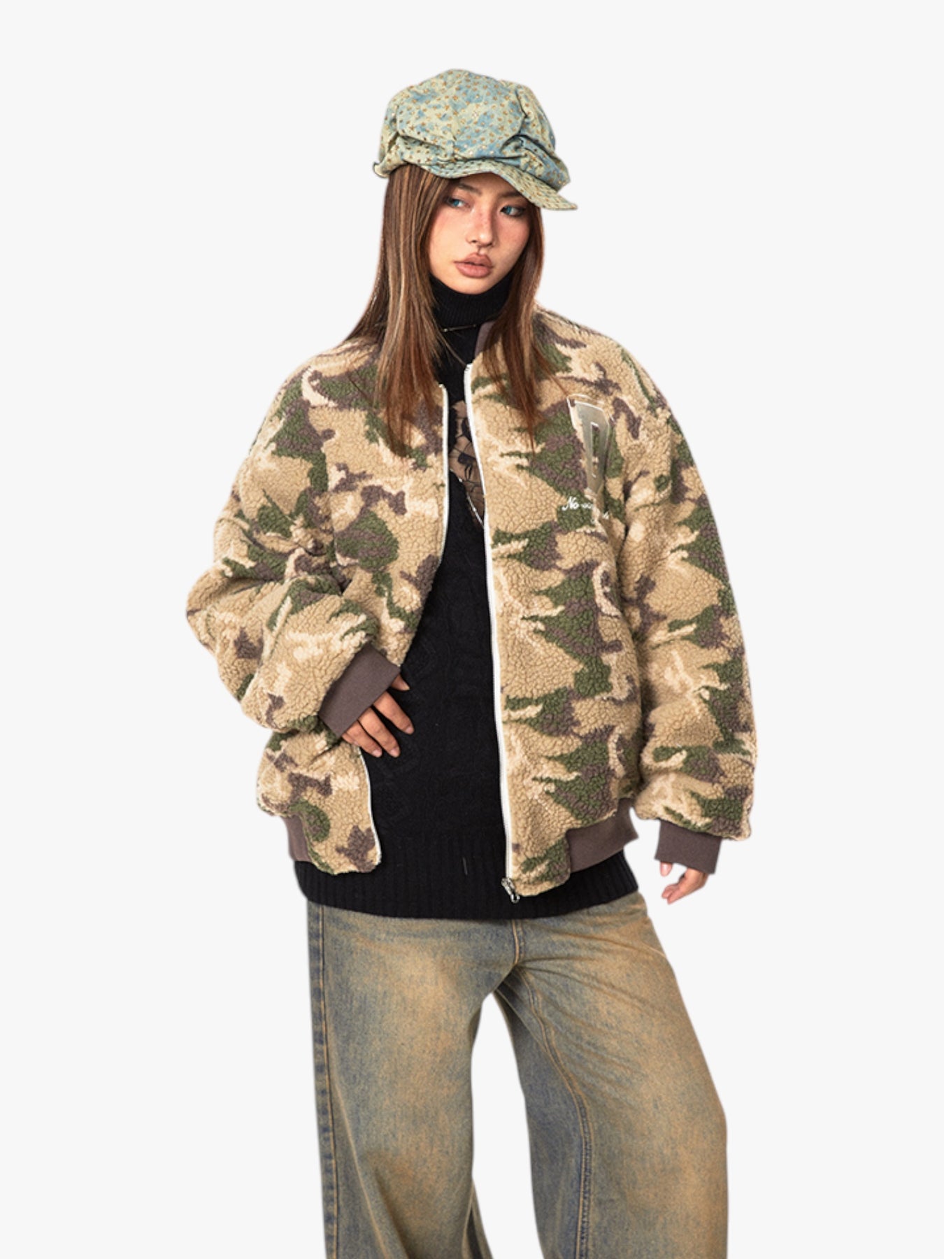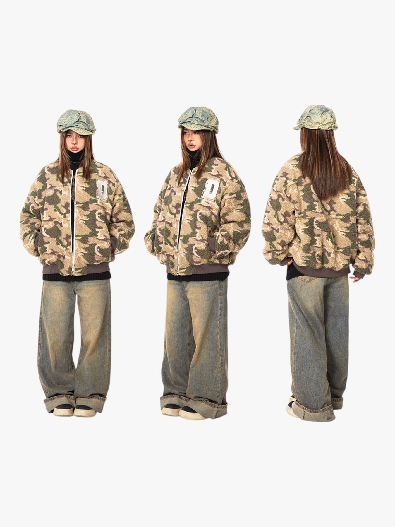 This jacket showcases a soft and cozy camouflage fleece design, perfect for staying stylish while keeping warm. It features a zip-up front and a bold “D” patch for added character, blending urban streetwear with a touch of rugged charm.