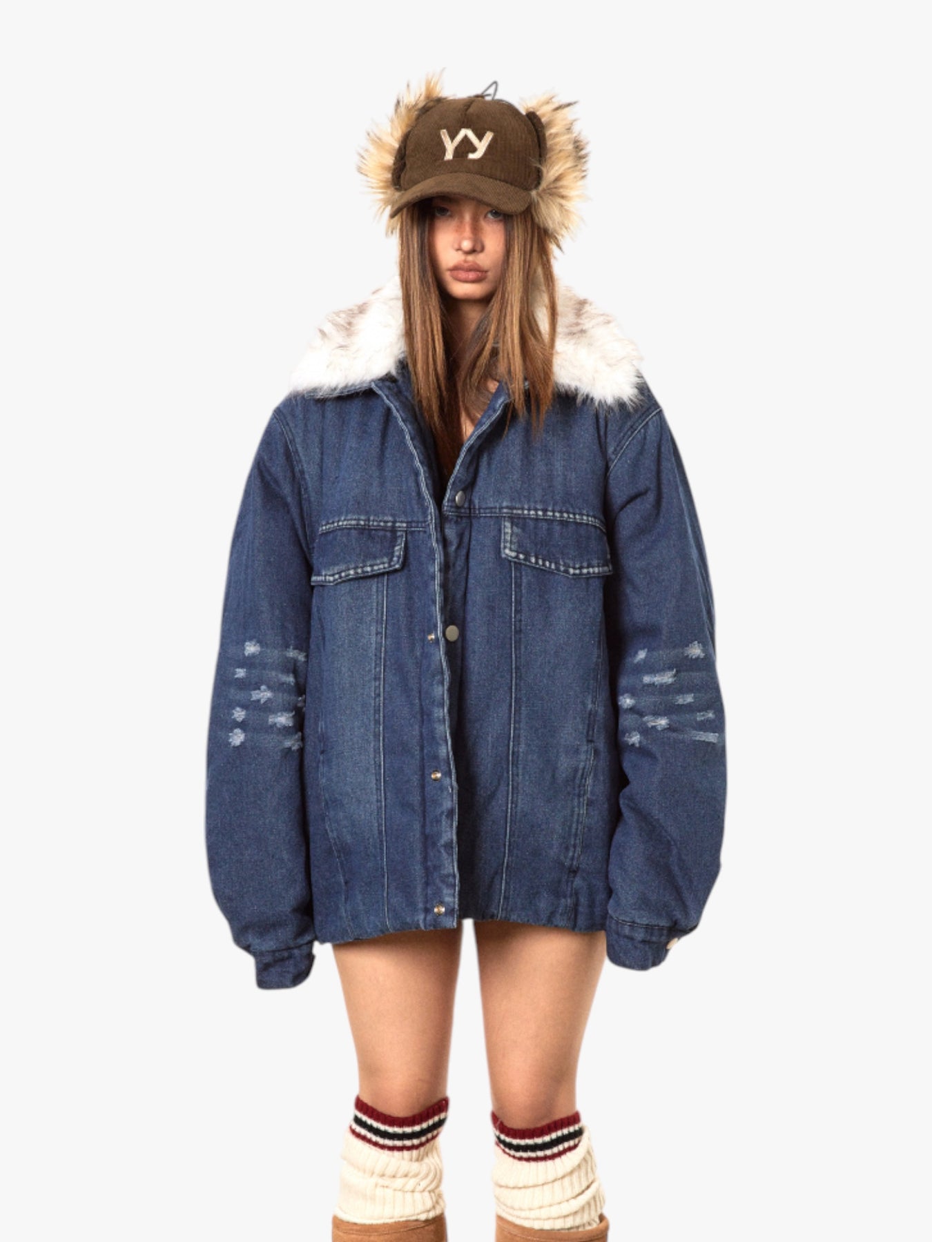 Add a touch of rugged elegance to your wardrobe with this denim jacket featuring a detachable soft faux fur collar. Designed for warmth and style, it includes distressed details on the sleeves and a relaxed fit, making it perfect for casual winter outings. Pair it with jeans or joggers for a timeless look!
