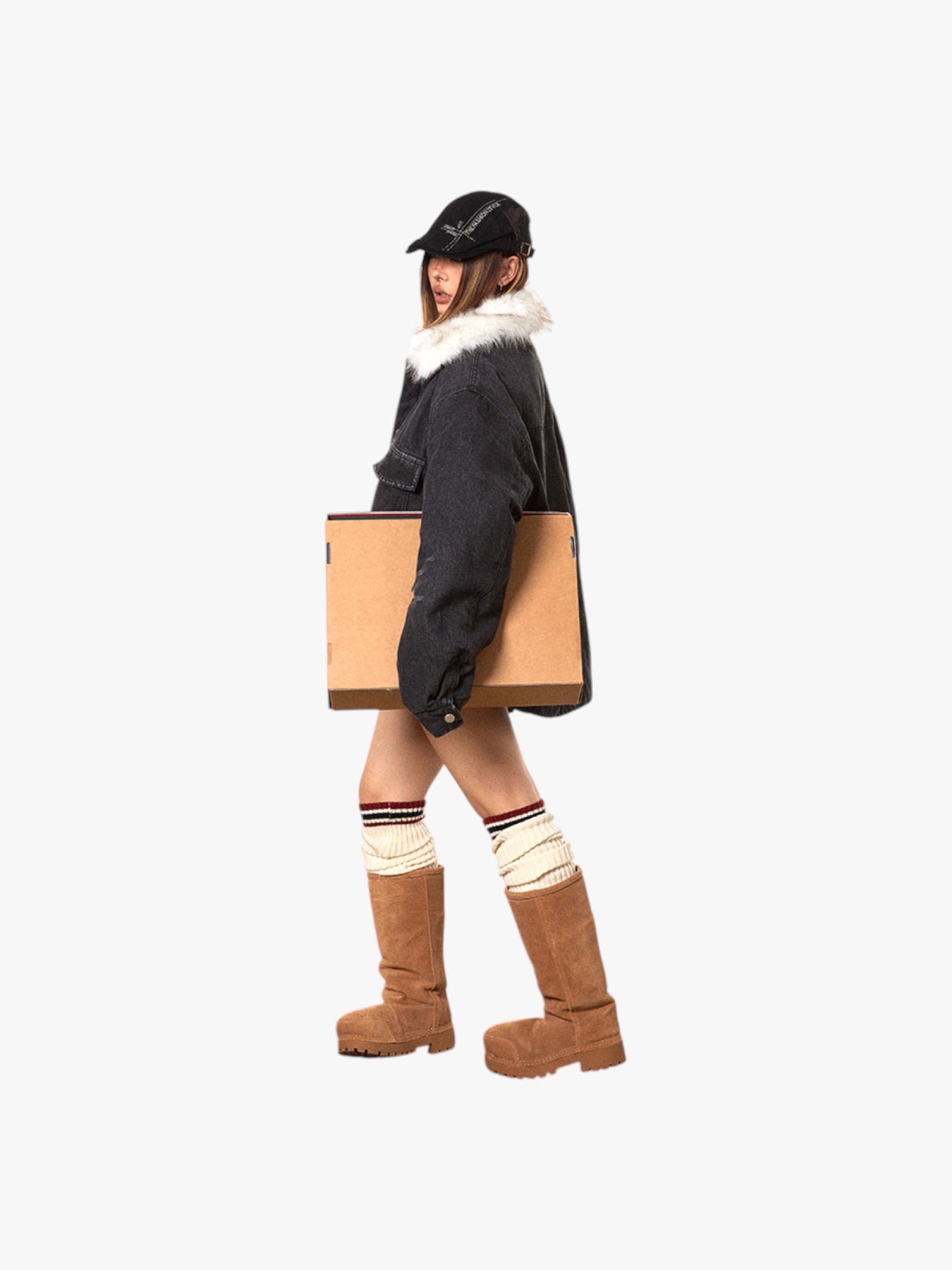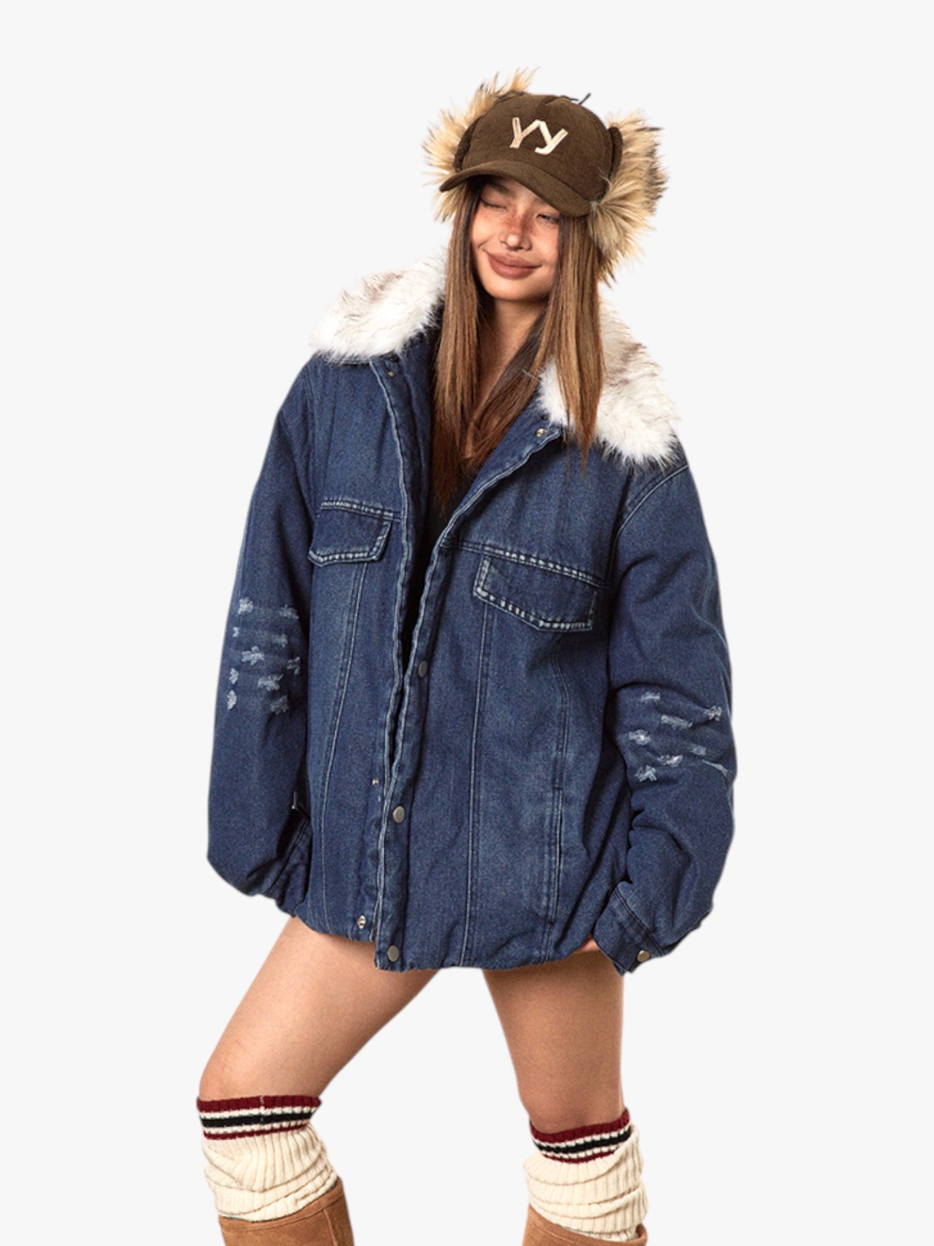 GKIKZ DETACHABLE FUR HEAVY DENIM JACKET