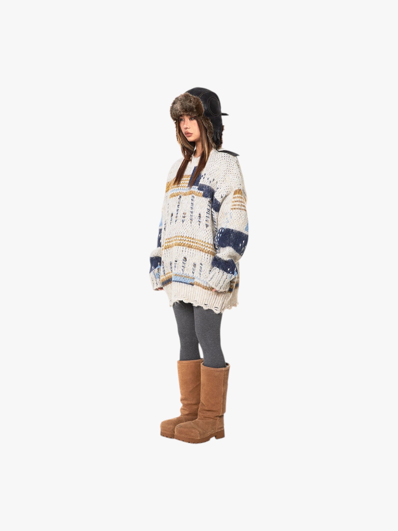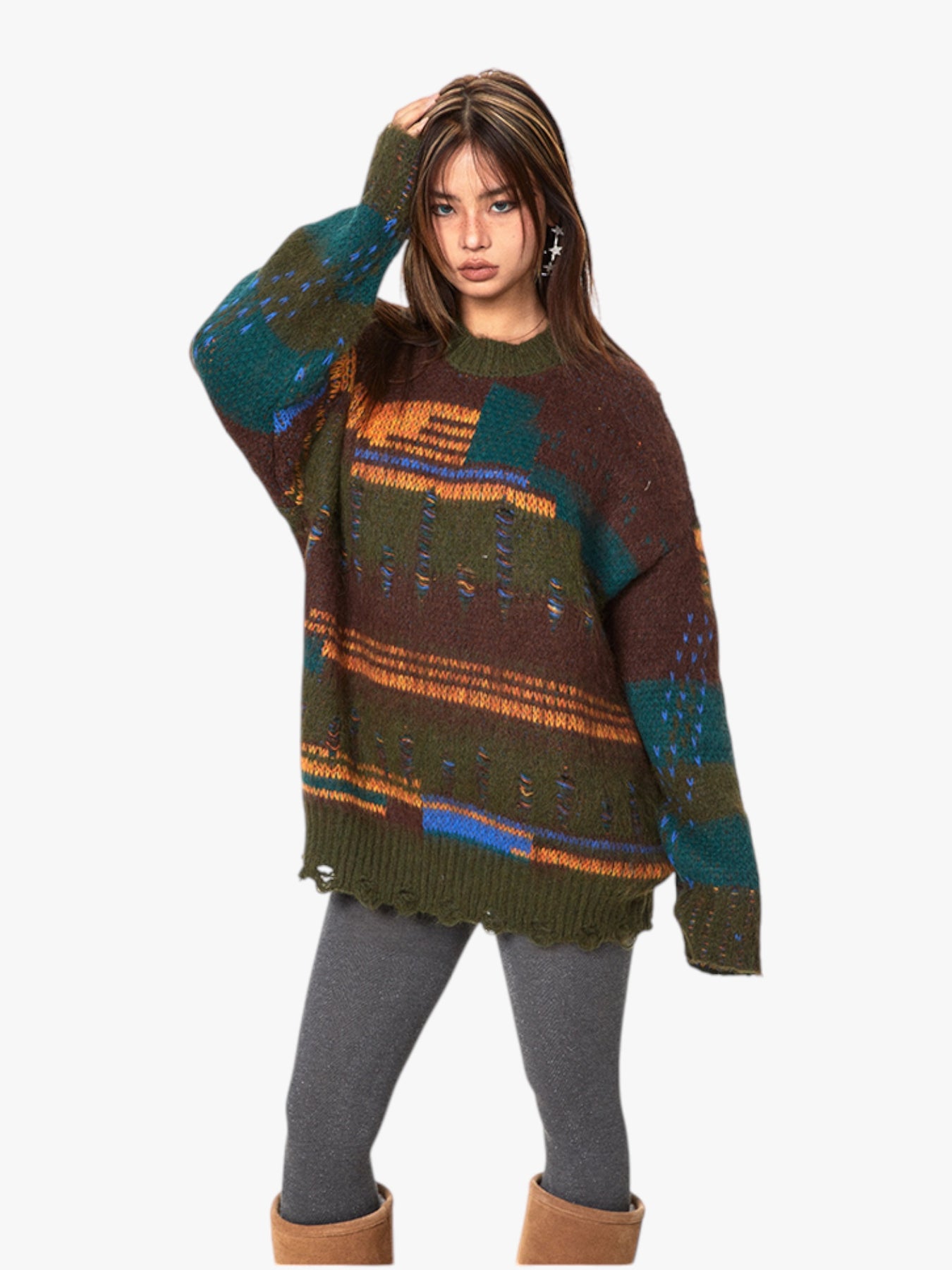 This sweater showcases a cozy yet bold design, perfect for the cooler seasons. It features an oversized fit with intricate patterns that blend earthy tones and artistic motifs, making it versatile for both casual outings and relaxed indoor wear. The soft, textured knit fabric ensures warmth and comfort while offering a unique aesthetic that stands out effortlessly.