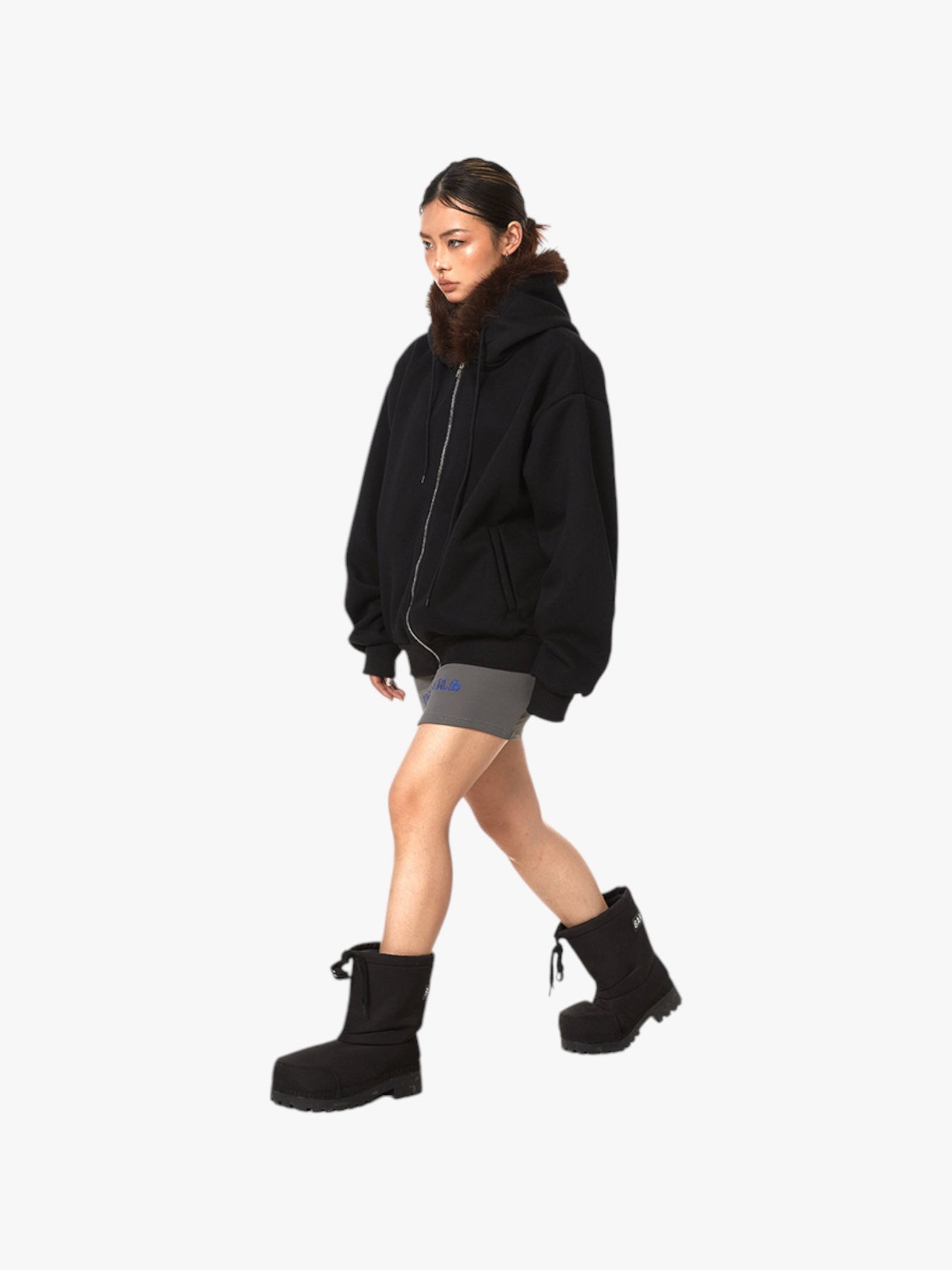 Stay cozy and stylish with this zip-up hoodie featuring a plush faux fur-lined hood for extra warmth. Designed for comfort, it offers a relaxed fit, soft fabric, and a versatile look that pairs effortlessly with any outfit. Available in classic black and white.