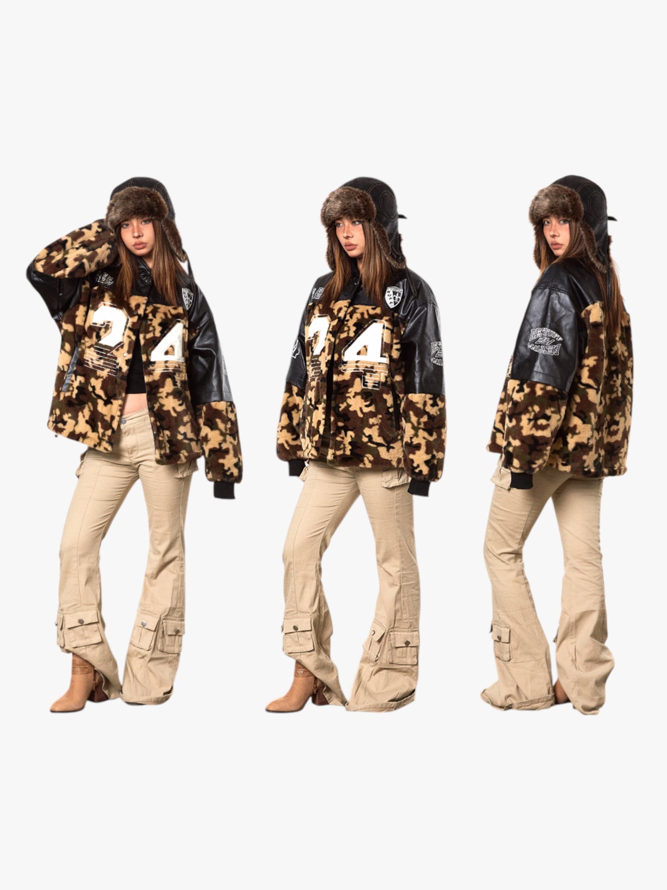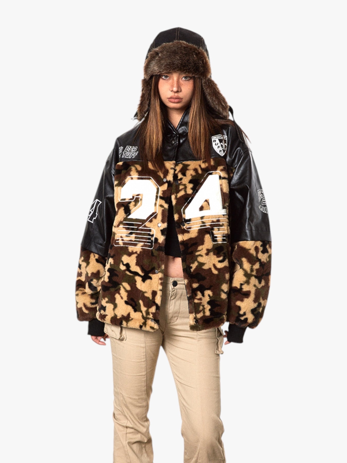 This camouflage jacket with bold “24” detailing and leather accents gives off a rugged and sporty vibe. Its unique combination of materials, including soft fur-like fabric and sleek leather patches, adds a premium touch. A statement piece for those looking to stand out in style.