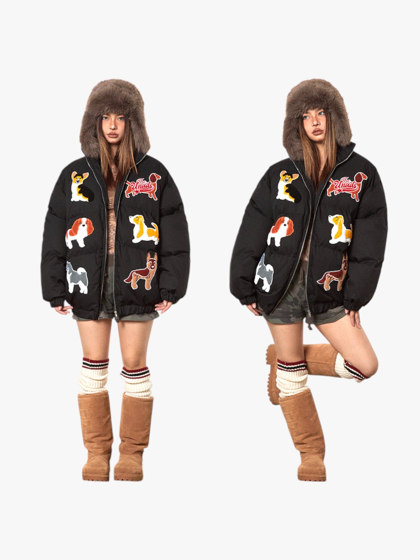 This cotton-padded jacket showcases cute puppy embroidery, adding a fun and quirky element to its functional design. Warm and stylish, it’s the perfect outerwear piece for making a statement on colder days.