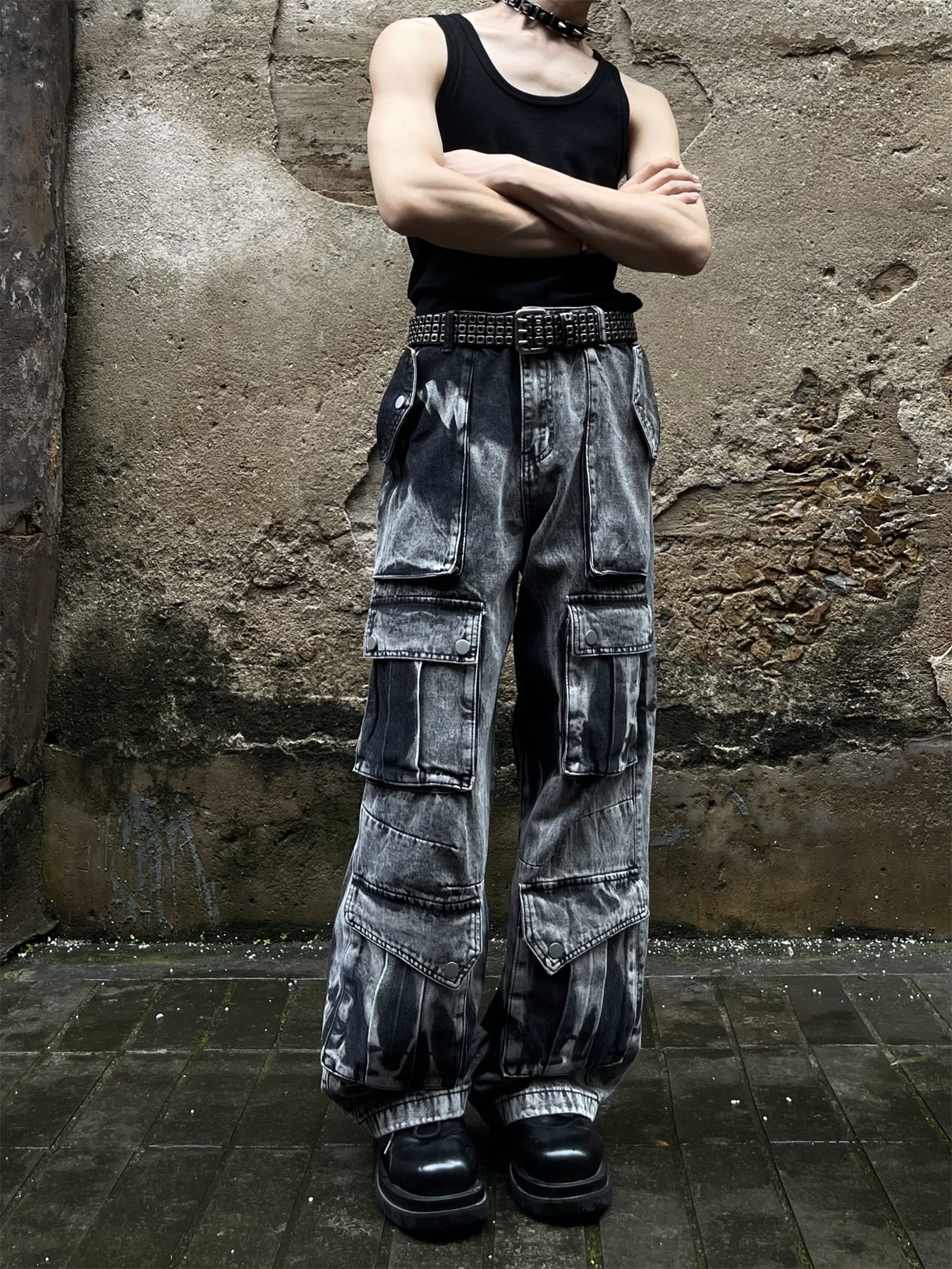 GKIKZ MULTI-POCKET TIE-DYE DENIM BAGGY JEANS