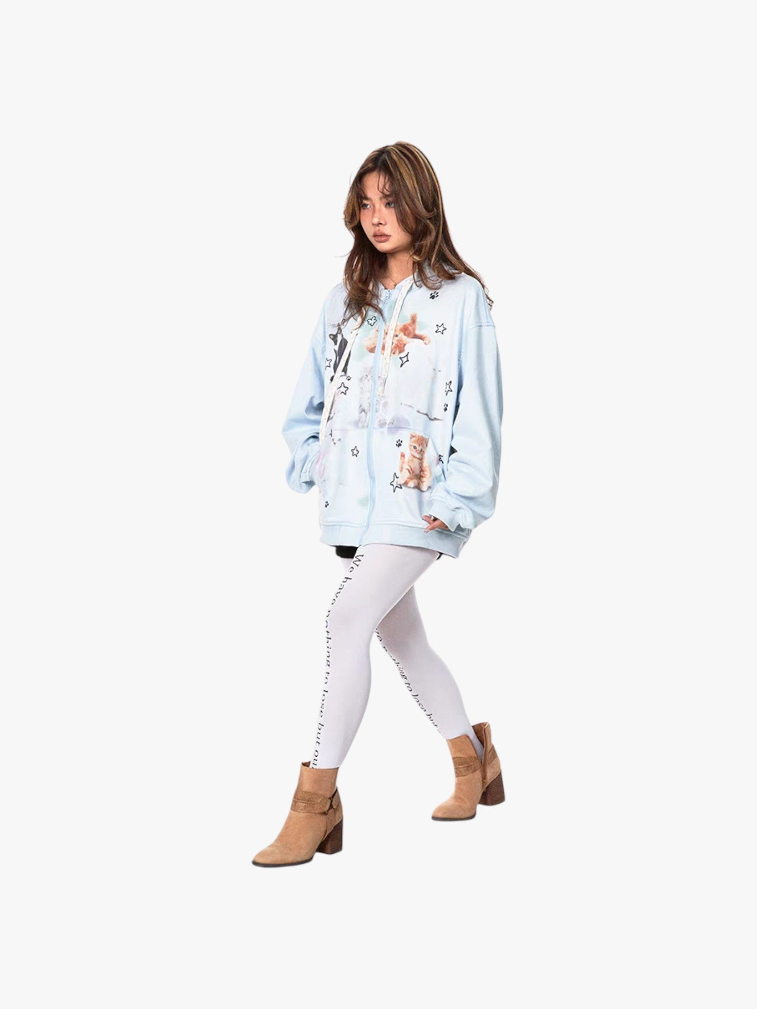 These oversized hooded zipper blend cozy comfort with playful charm, featuring an adorable cat-themed print on soft pastel fabric. The relaxed fit, adjustable drawstring hood, and zip-up front make them a versatile staple for laid-back styling. Perfect for layering, these hoodies add a whimsical touch to any casual outfit while keeping you warm and stylish.