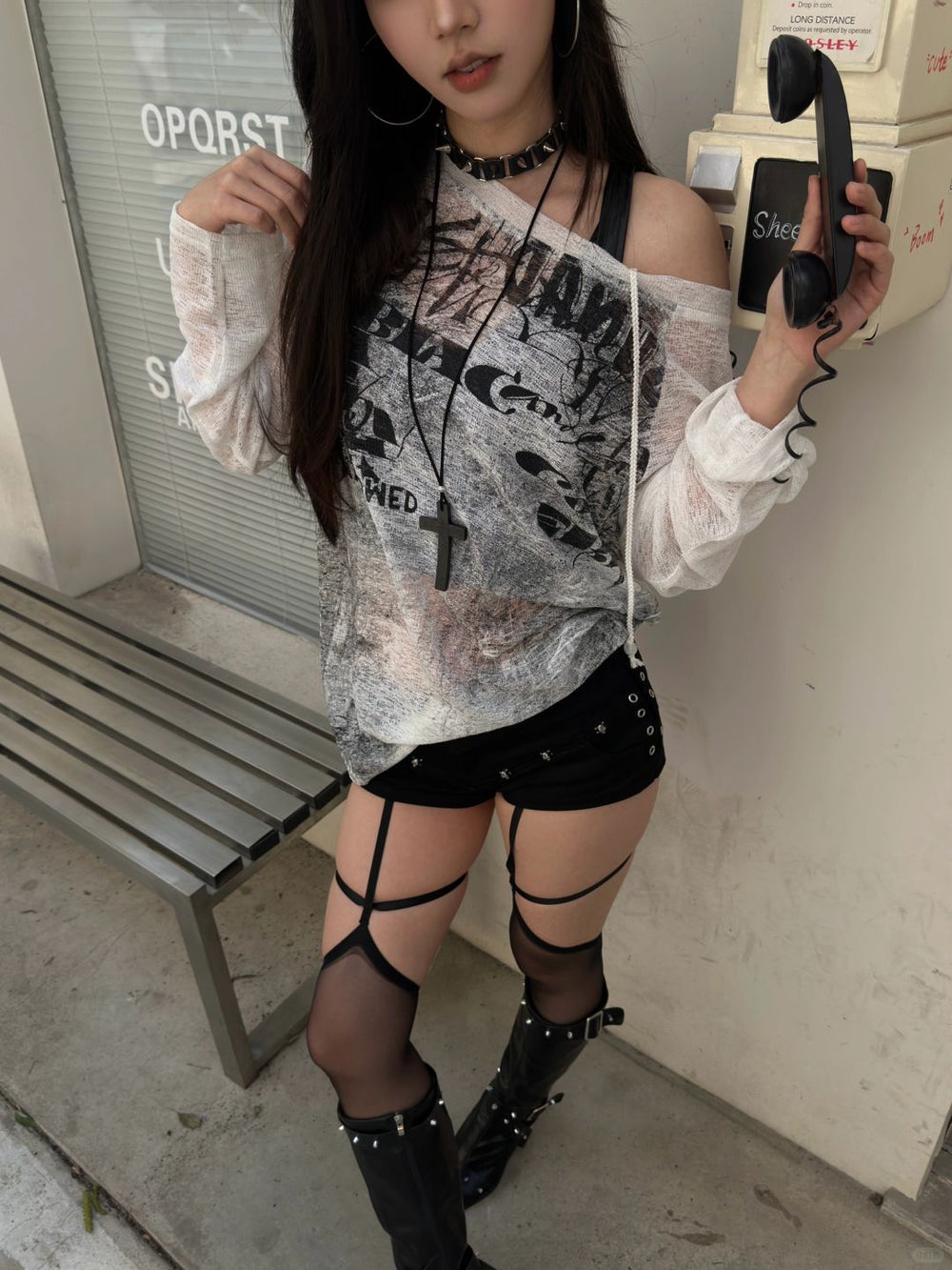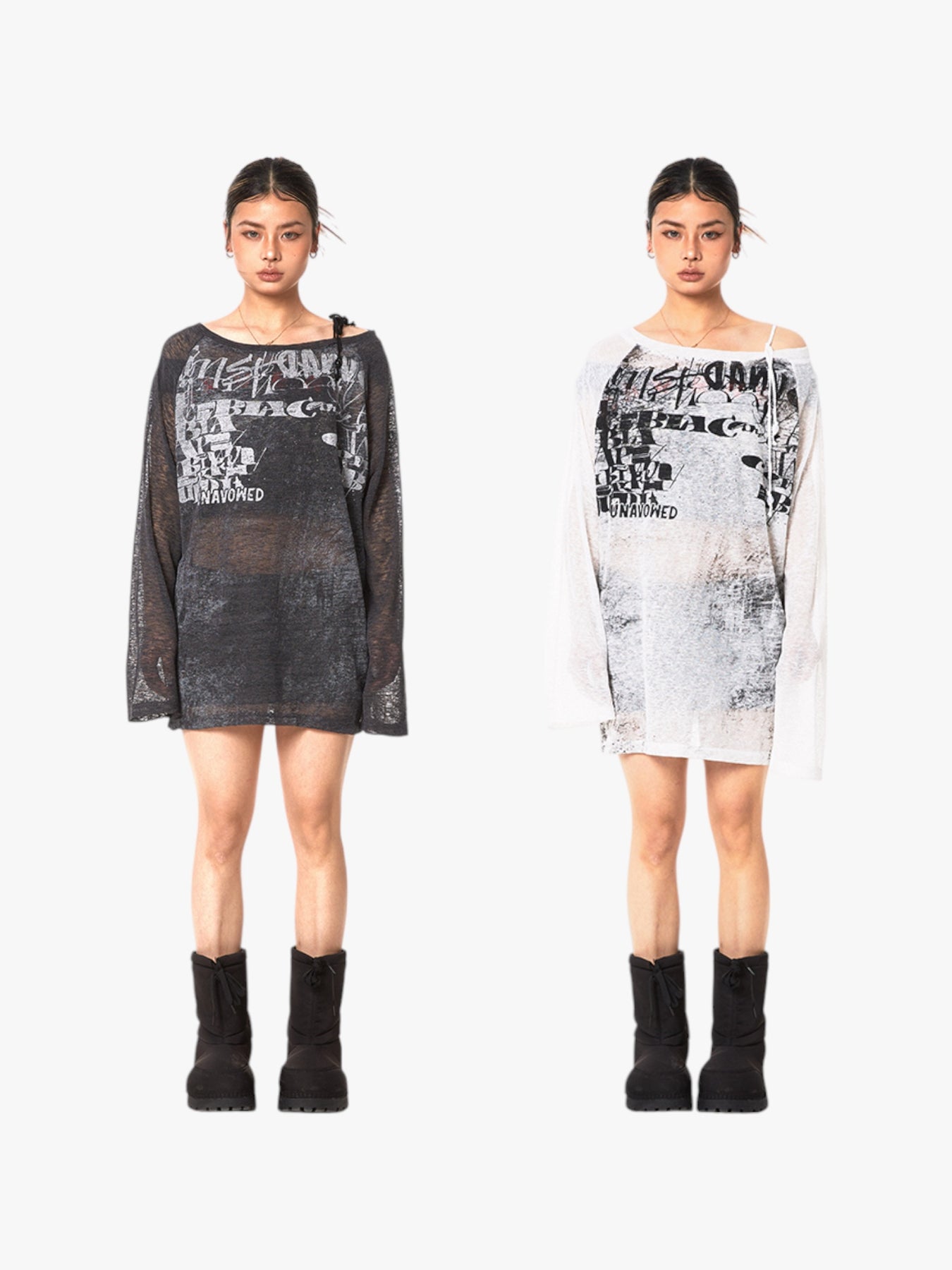 Effortlessly edgy and lightweight, this sheer off-shoulder top features a distressed graphic print and an asymmetrical drawstring detail for a customizable fit. Perfect for layering or wearing solo, it adds a grunge-inspired touch to any outfit.