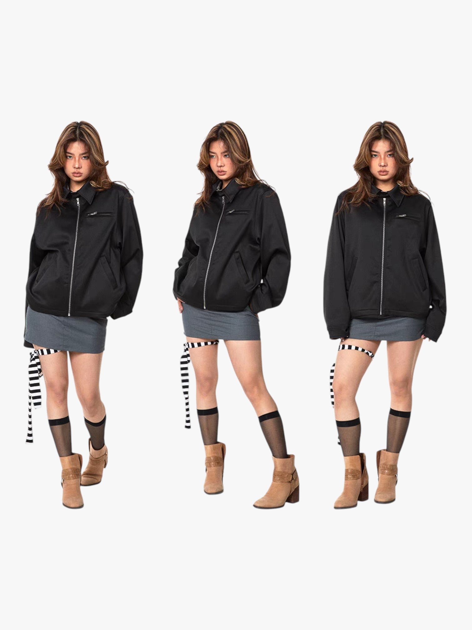 This classic zip-up jacket blends casual and formal elements with its structured silhouette and minimalist design. Featuring a smooth outer finish, a zippered chest pocket, and adjustable cuffs, it offers both style and functionality. Available in neutral tones, this versatile jacket is perfect for layering over any outfit, making it an essential wardrobe staple.