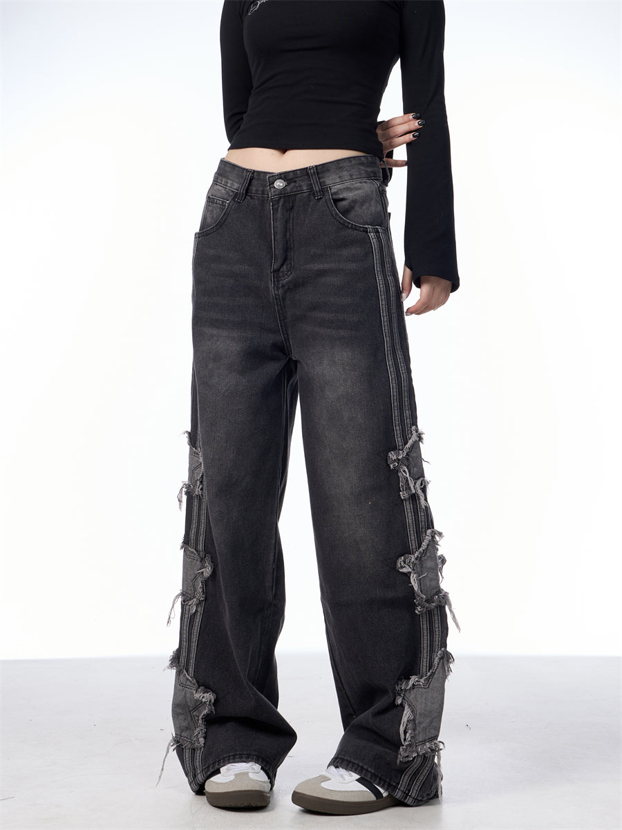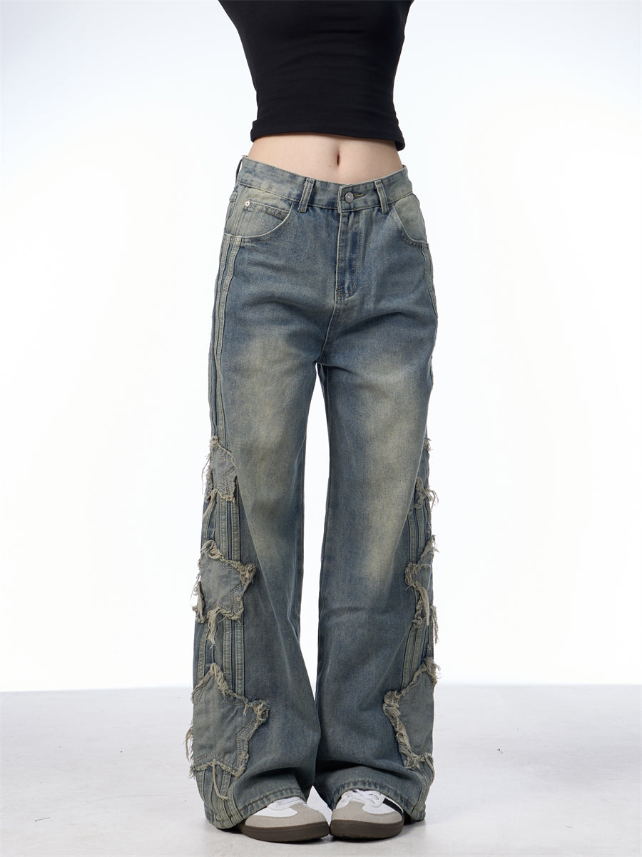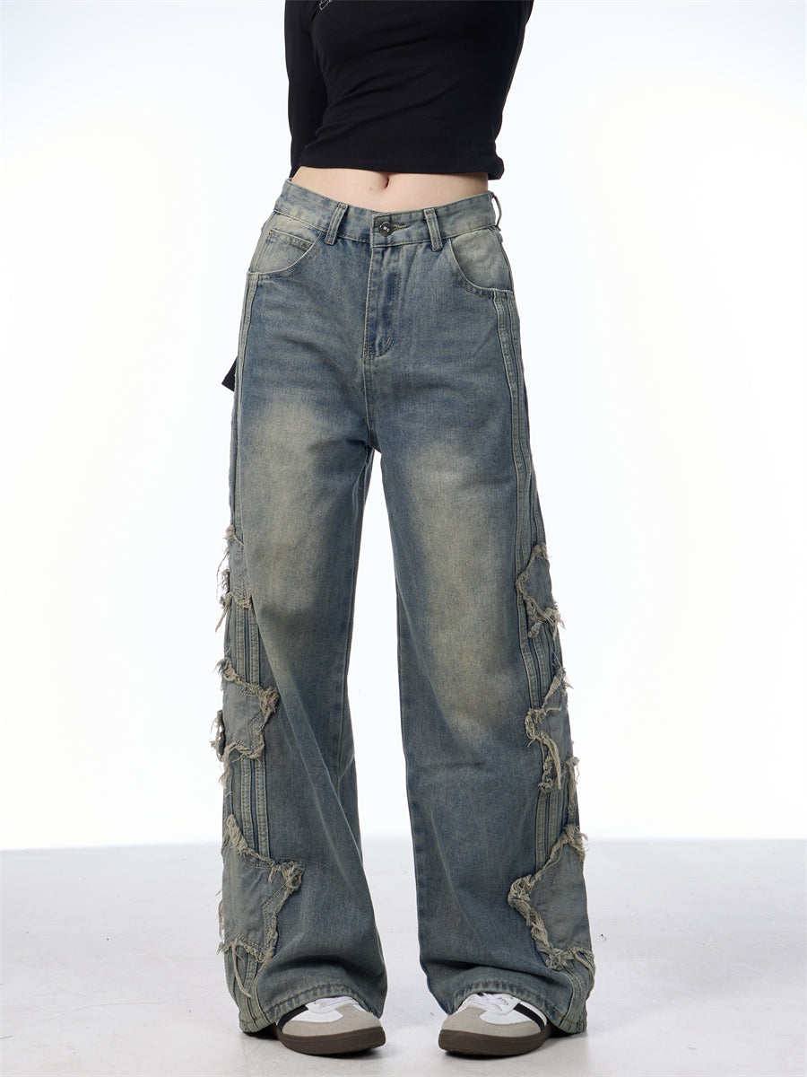 Make a statement with these wide-leg denim jeans, featuring three ripped and distressed star designs along the sides for a bold, edgy touch. The relaxed fit and unique side detailing make these jeans perfect for effortlessly cool streetwear looks.