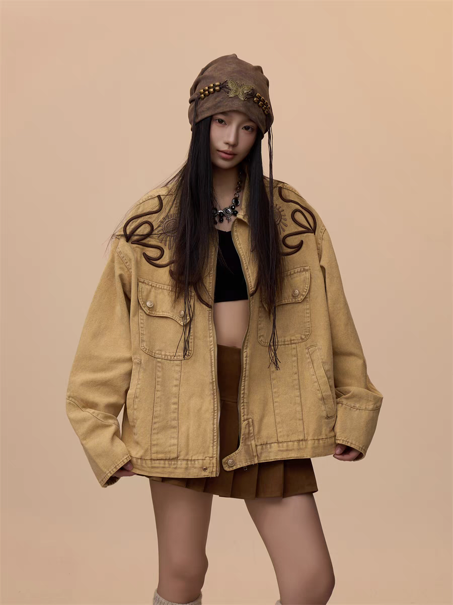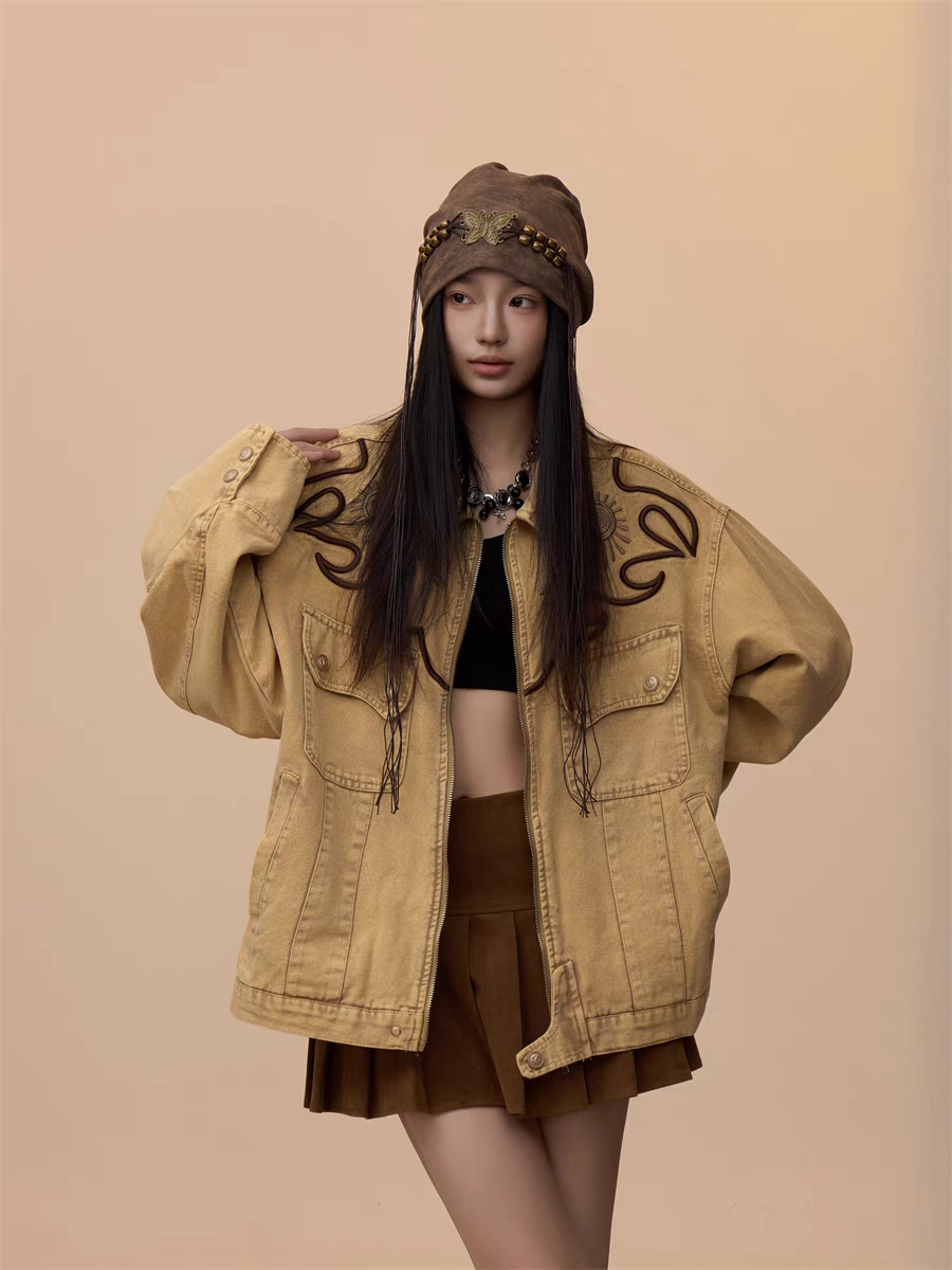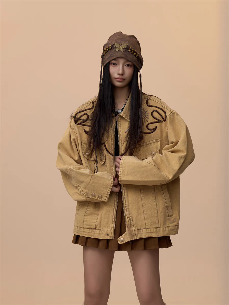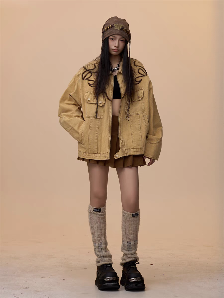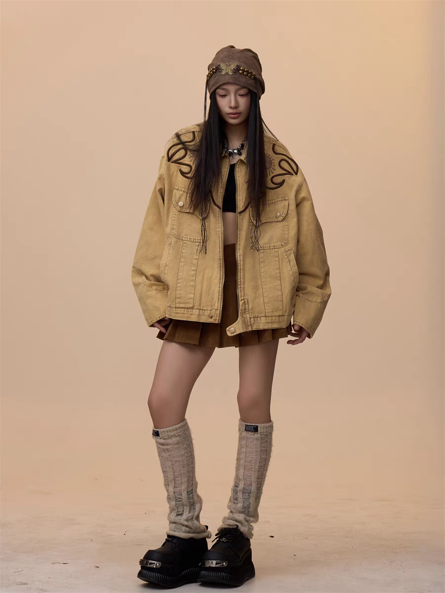 Step into effortless style with our Vintage Khaki Embroidered Denim Jacket, a must-have for casual yet bold fashion statements. Designed with a relaxed, oversized fit, this jacket blends timeless denim with intricate embroidered detailing, perfect for layering over any outfit.
