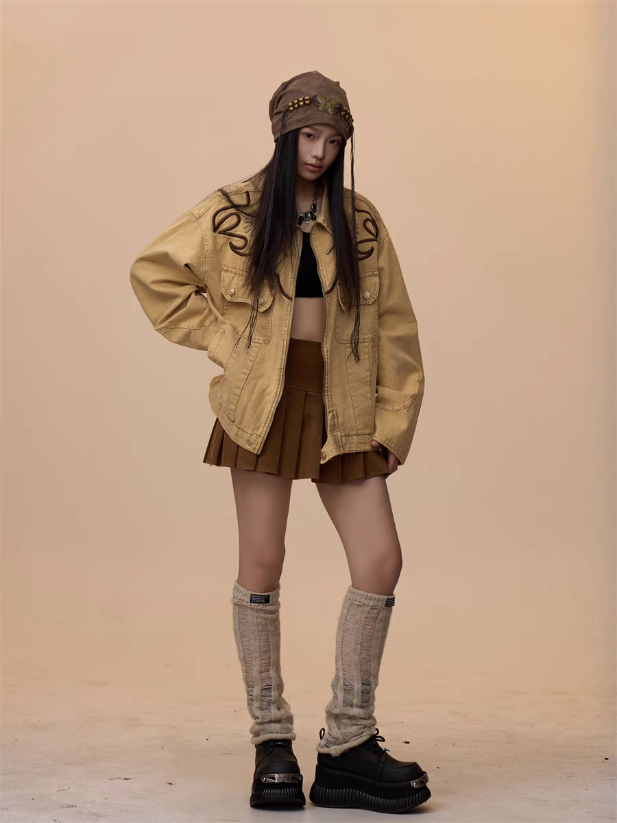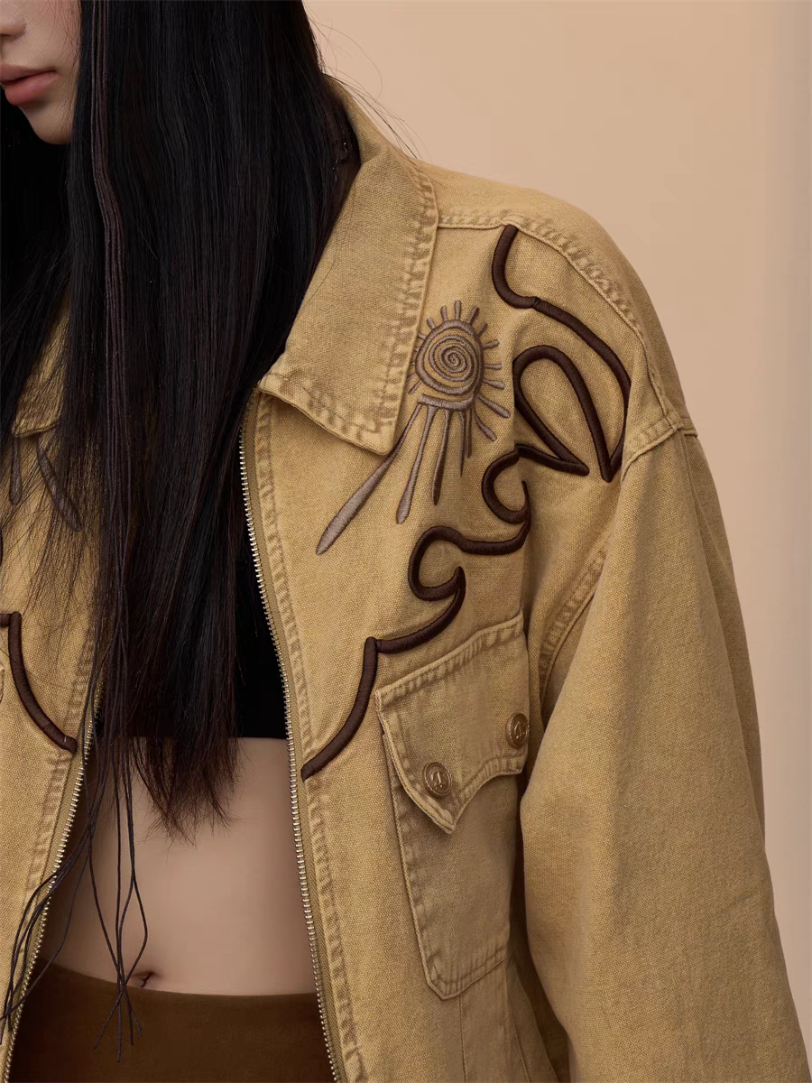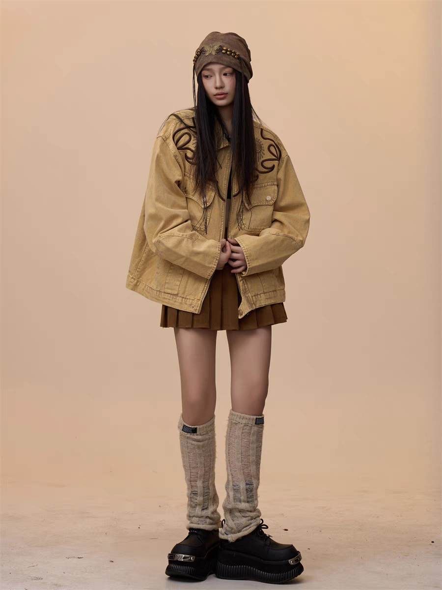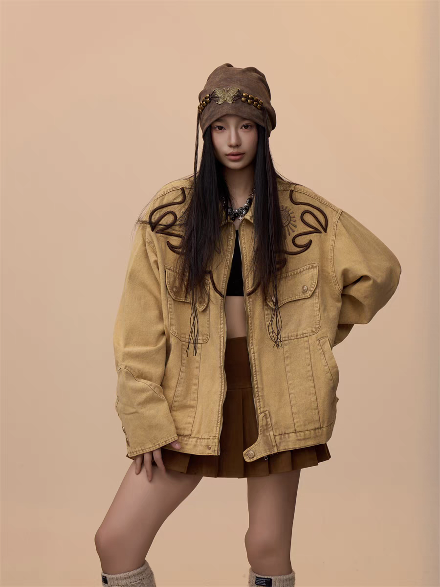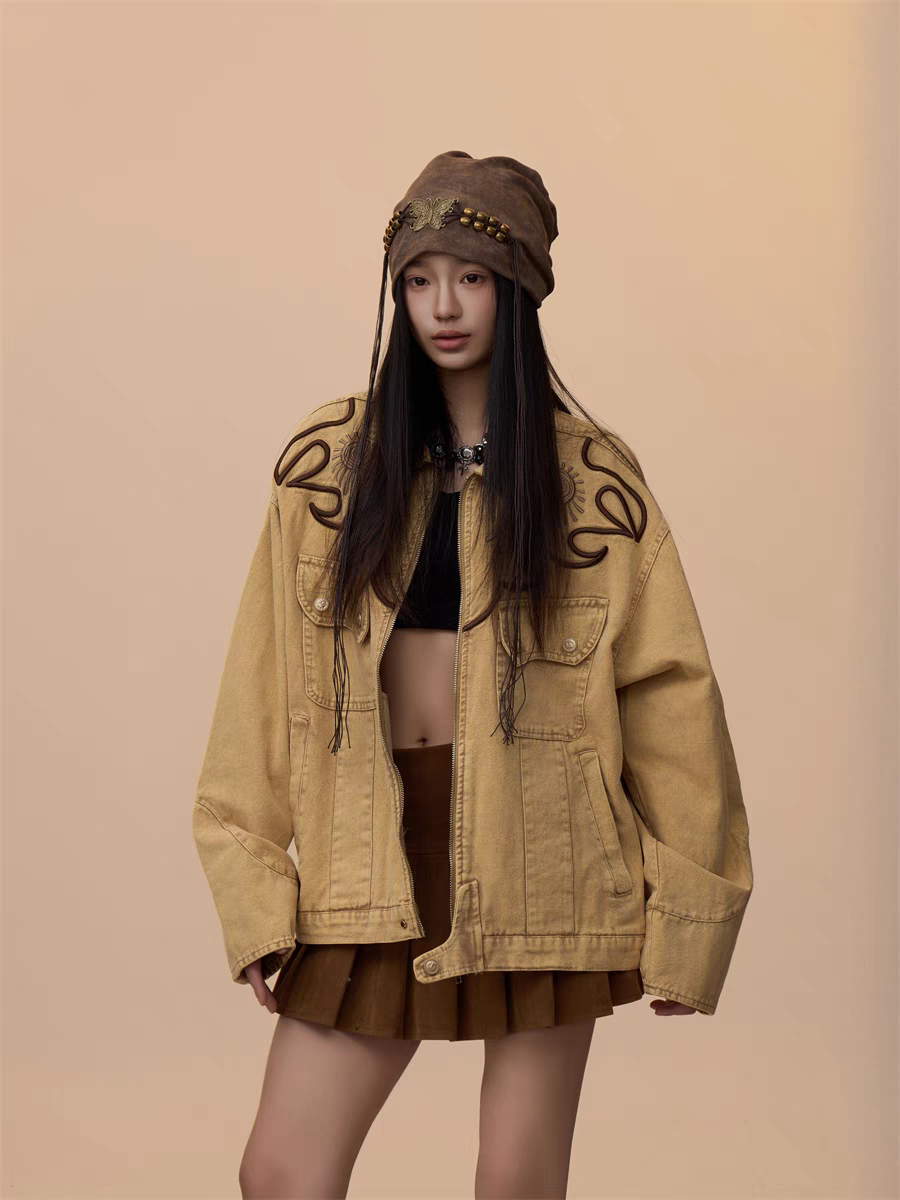 Step into effortless style with our Vintage Khaki Embroidered Denim Jacket, a must-have for casual yet bold fashion statements. Designed with a relaxed, oversized fit, this jacket blends timeless denim with intricate embroidered detailing, perfect for layering over any outfit.